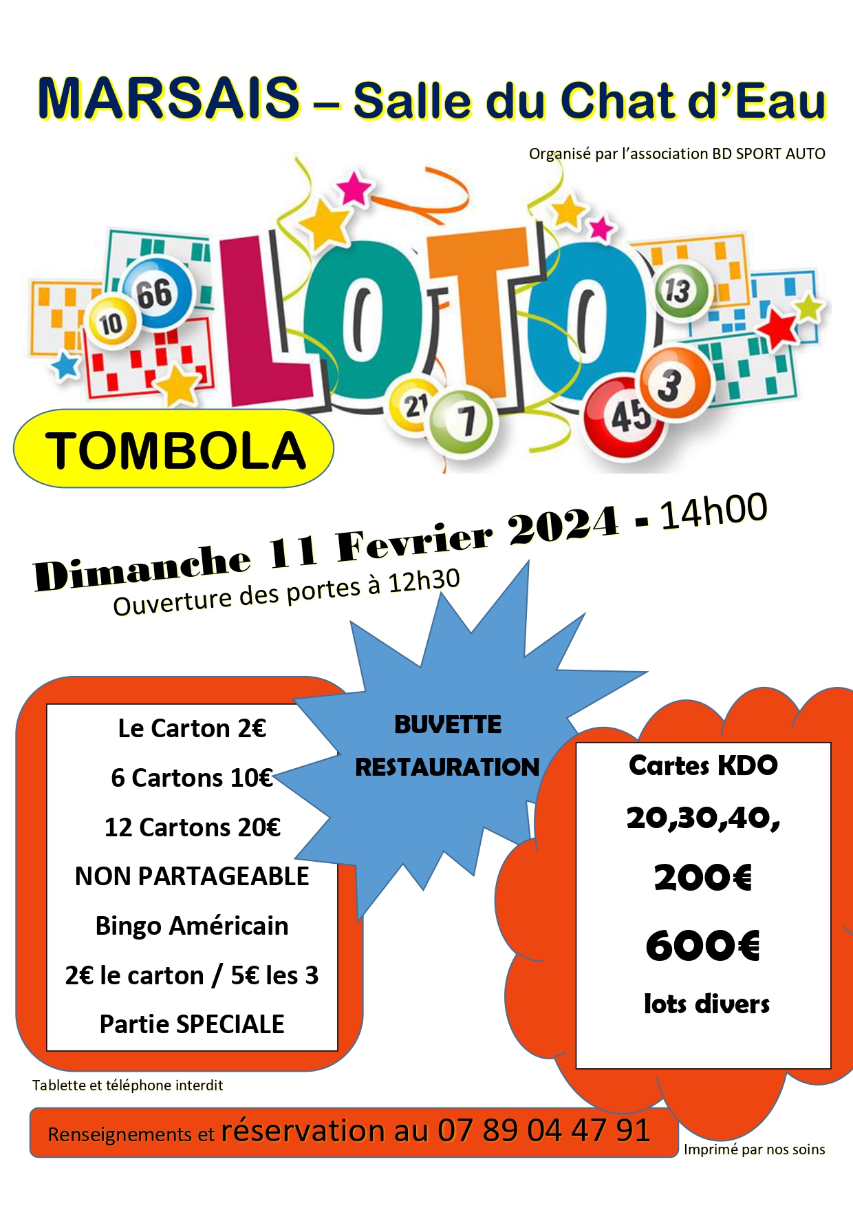 À Marsais, l’association BD sport auto organise un loto dimanche 11 février, à la salle du chat d’eau, à 14h. À gagner : des cartes cadeaux de 20 à 600€ et de nombreux autres lots. 2€ le carton, 10€ les 6 et 20€ les 12. Non-partageables. Partie spéciale. Tombola. Bingo Américain à 2€ le carton et 5€ les 3. Restauration et buvette sur place. Jouer avec tablette et téléphone interdit. Renseignements et réservations au 07 89 04 47 91. Ouverture des portes à 12h30.