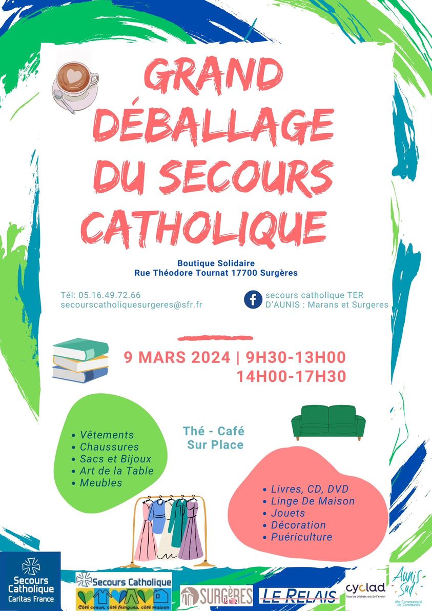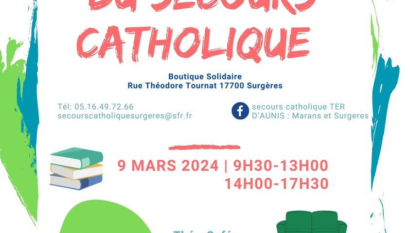 Le Secours catholique organise un grand déballage samedi 9 mars, à la boutique du Secours catholique, rue Théodore Tournat, à Surgères. Ouverte de 9h30 à 13h et de 14h à 17h30. Sur place, vous y trouverez des vêtements, mobilier, vaisselle, linge de maison, jouets et bien d’autres. Thé et café vous seront proposés. Pour les renseignements, vous pouvez contacter le 05 16 49 72 66 et par mail à secourscatholiquesurgeres@sfr.fr.
