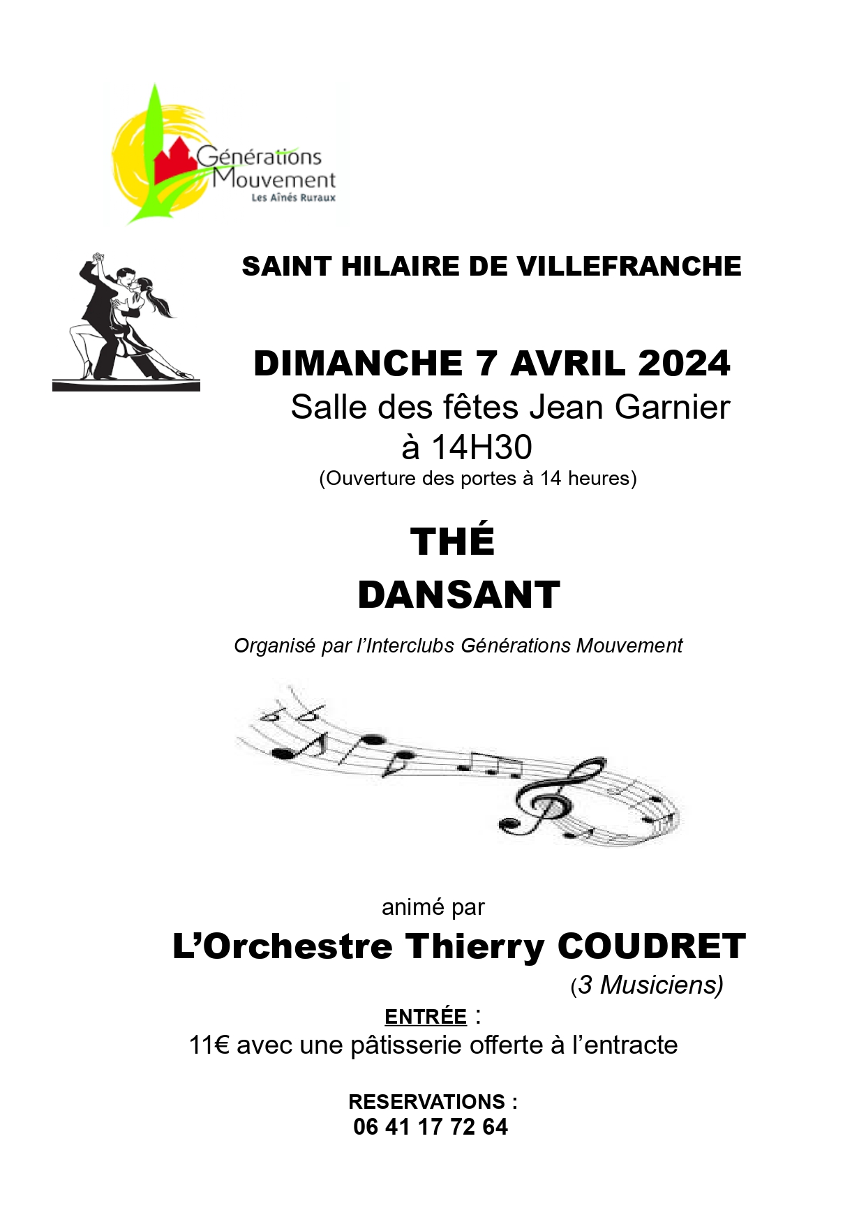 À Saint-Hilaire-de-Villefranche, l’Interclubs génération mouvement organise un thé dansant dimanche 7 avril, à la salle des fêtes Jean-Garnier, à 14h30. Il sera animé par l’orchestre de Thierry Coudret et ses trois musiciens. L’entrée est à 11€ avec une pâtisserie offerte à l’entracte. Renseignements et réservations au 06 41 17 72 64.