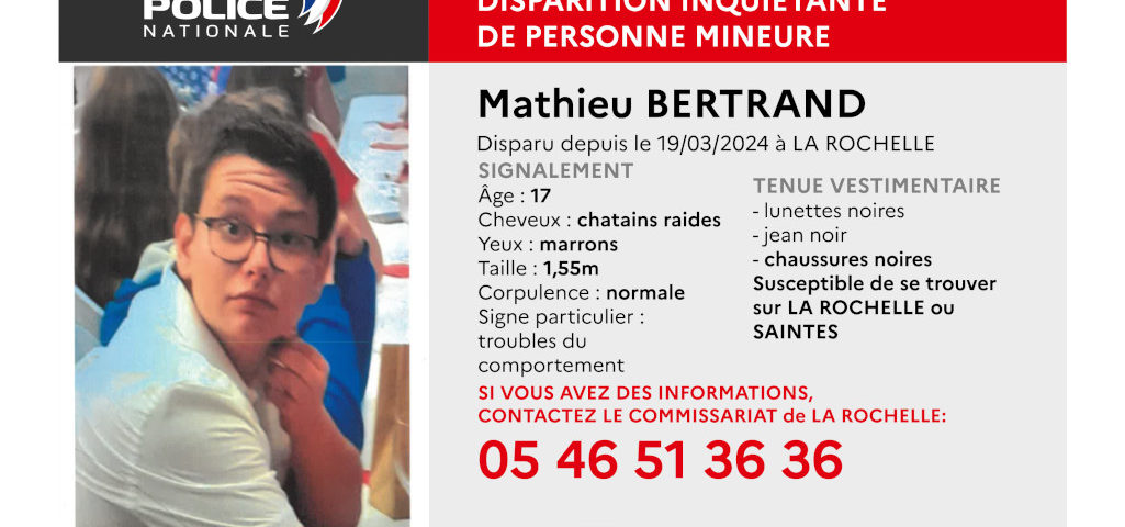 La police nationale de la Charente-Maritime lance un appel à témoins après la disparition inquiétante d’un jeune homme de 17 ans à La Rochelle. Il s’agit de Mathieu Bertrand qui n’a plus donné de nouvelles à ses proches depuis mardi dernier, après avoir quitté le Lycée maritime et aquacole où il était scolarisé. L’adolescent, qui souffre de troubles du comportement, serait parti avec un sac poubelle contenant ses affaires. Il a les cheveux châtains, les yeux marrons, il mesure 1,55m. Le jour de sa disparition, il portait un jean noir, des chaussures noires et des lunettes noires. Il pourrait se trouver à La Rochelle ou Saintes. Si vous avez des informations, vous pouvez contacter le commissariat de La Rochelle au 05 46 51 36 36.
