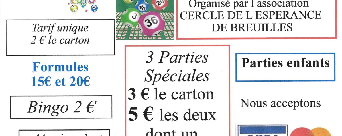 L’association Le Cercle de l’espérance de Breuilles organise un loto samedi 20 avril, à 20h30, la salle des fêtes de Bernay-Saint-Martin. Animé par Phil. 44 quines dont 3 au bingo. À gagner : plus de 2.500€ de lots uniquement en bons d’achats dont un de 100, un de 150 et un de 600€. Tarif unique 2€ le carton. Bingo à 2€. Formules à 15 et 20€. Partie spéciale à 3€ le carton et 5€ les 2 pour un bon d’achat de 200€. Parties enfants. Tombola. Sur place buvette, sandwichs et crêpes. Paiement par carte bancaire possible. Réservation au 06 66 56 30 09 ou au 06 31 96 84 80. Ouverture des portes à 19h.