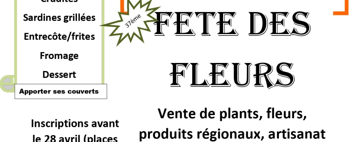 C’est la 37ème édition de la Fête des fleurs à Saint-Loup, entre Landes et Surgères. Organisée par la Société des fêtes dimanche 05 mai, de 9h à 17h. Sur place : vente de plants, fleurs, arbustes, produits régionaux et locaux et artisanat. L’entrée est libre. De l’animation toute la journée, et à 15h ambiance musicale avec le groupe « Les Bretelles se détendent ». Un repas entrecôte sous tivoli vous est proposé à 12h30 pour 25€ par adulte. Au menu : apéritif, crudités, sardines grillées, entrecôte, frites, salade, fromage et dessert. Apportez vos couverts. Sur place buffet, buvette, tombola et structures gonflables pour les enfants. Les réservations du repas se font au 05 46 59 76 42 ou au 06 30 56 56 28. Places limitées.