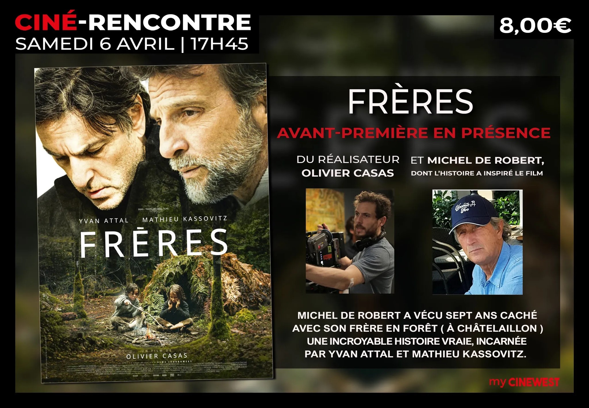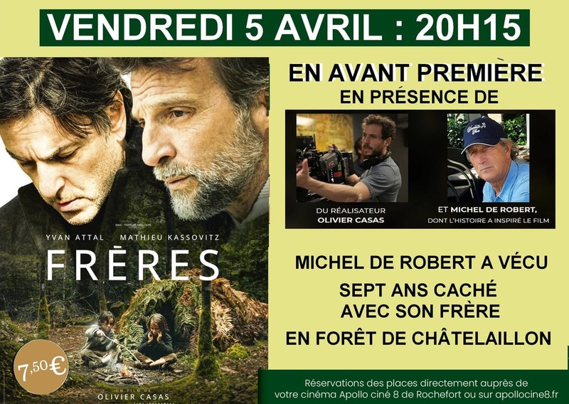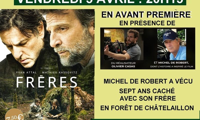 La projection ce soir en avant-première au cinéma de Rochefort du film « Frères » d’Olivier Casas, avec Yvan Attal et Mathieu Kassovitz. L’histoire vraie de deux garçons de 5 et 7 ans, abandonnés par leur mère en 1948, qui ont vécu cachés 7 ans dans une forêt de Châtelaillon-Plage. C’est à 20h15 à l’Apollo ciné 8, en présence du réalisateur et de Michel De Robert dont l’histoire a inspiré le long-métrage. Deux autres séances sont prévues demain à 16h au cinéma Le Lido de Royan et à 17h45 à l’Atlantic ciné de Saintes.