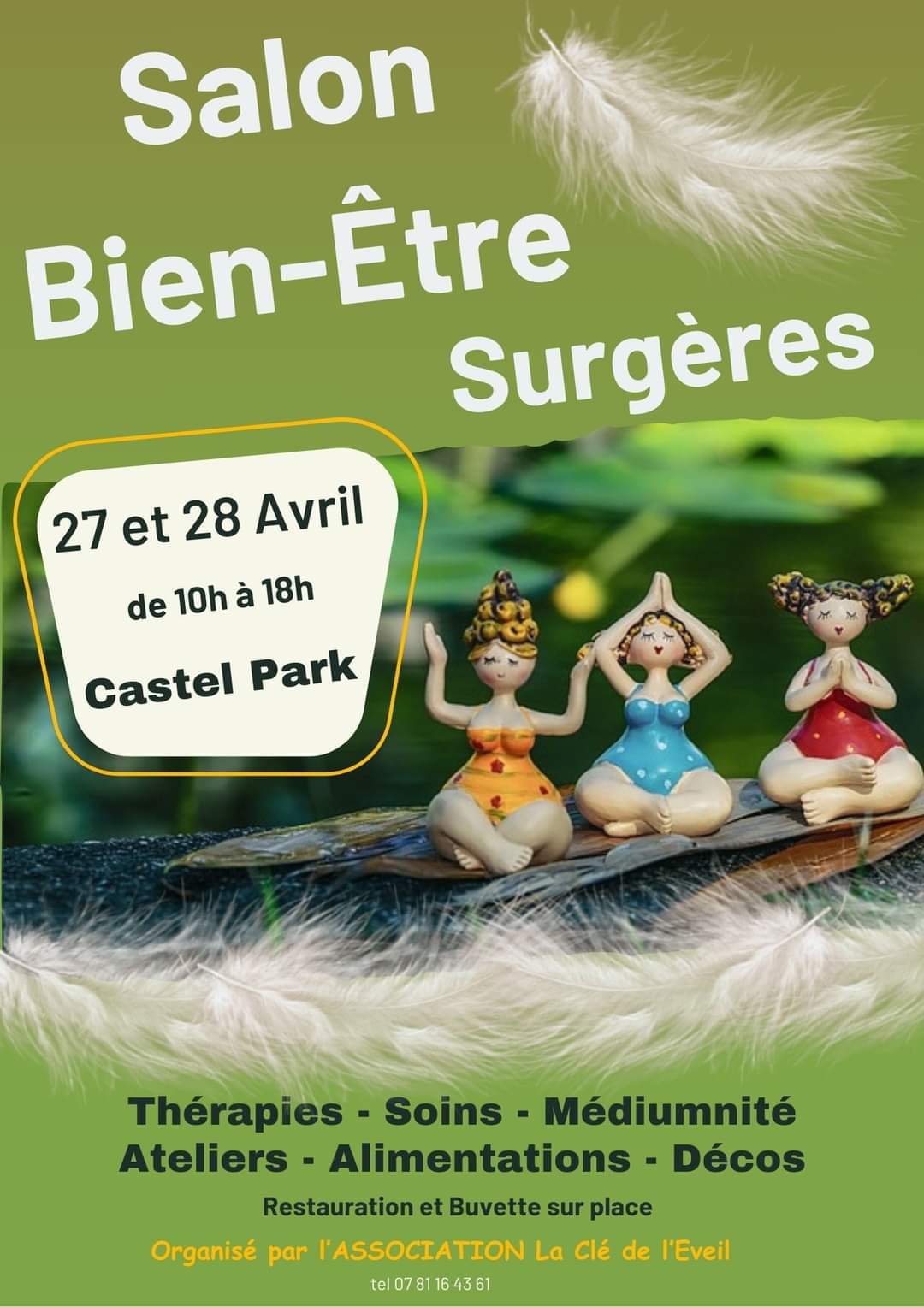 L’association La Clé de l’éveil organise son Salon du bien-être samedi 27 et dimanche 28 avril à Surgères. Rendez-vous à la salle du Castel Park, de 10h à 18h. Sur place : thérapies, soins, médiumnité, ateliers, alimentations, décos et conférences. Restauration et buvette. Pour les renseignements, vous pouvez contacter le 07 81 16 43 61.
