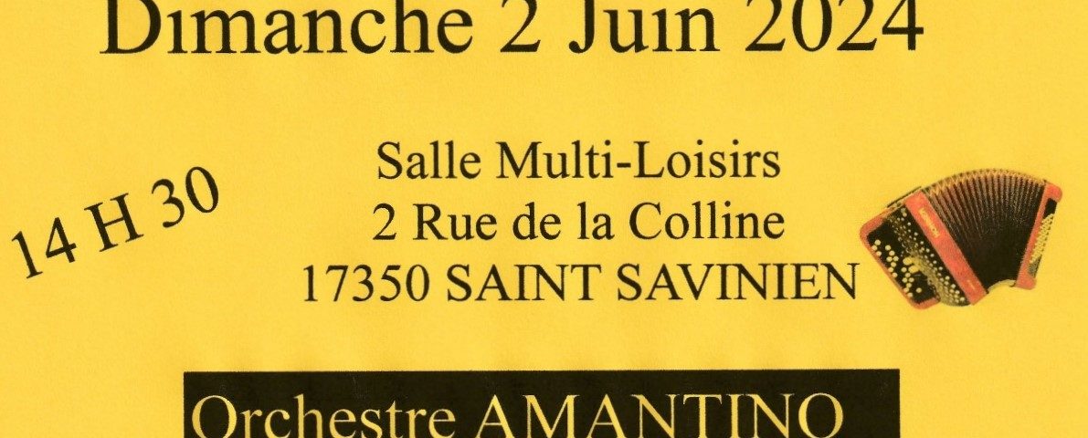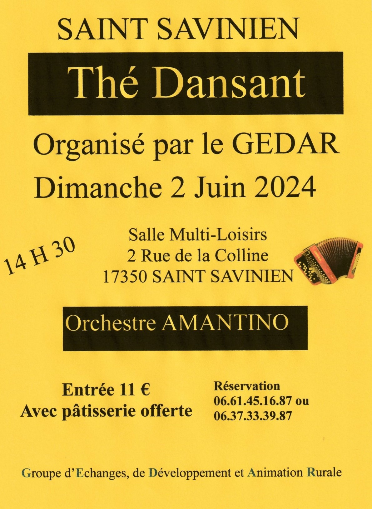 À Saint-Savinien, le GEDAR organise un thé dansant dimanche 2 juin, à 14h30, à la salle Multi-loisirs, 2 rue de la colline. Il sera animé par l’orchestre Amantino. L’entrée est à 11€ avec une pâtisserie offerte. Renseignements et réservations au 06 61 45 16 87 ou au 06 37 33 39 87.