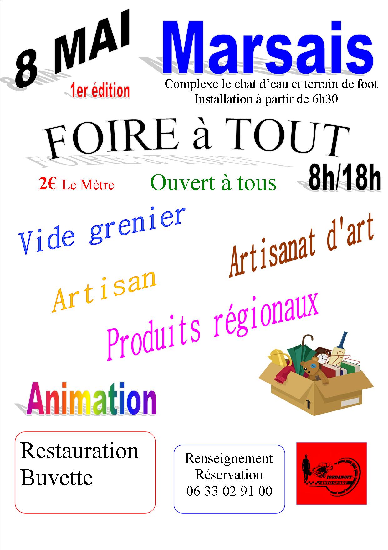 À Marsais, l’association Jordanoff organise la 1ère édition de la Foire à tout, mercredi 8 mai, de 8h à 18h, au complexe du Chat d’eau et sur le terrain de foot. Installation dès 6h30. Ouvert à tous. 2€ le mètre. Sur place : vide-greniers, artisans, artisanat d’art, produits régionaux et animation. Buvette et restauration. Renseignements et réservations au 06 33 02 91 00.