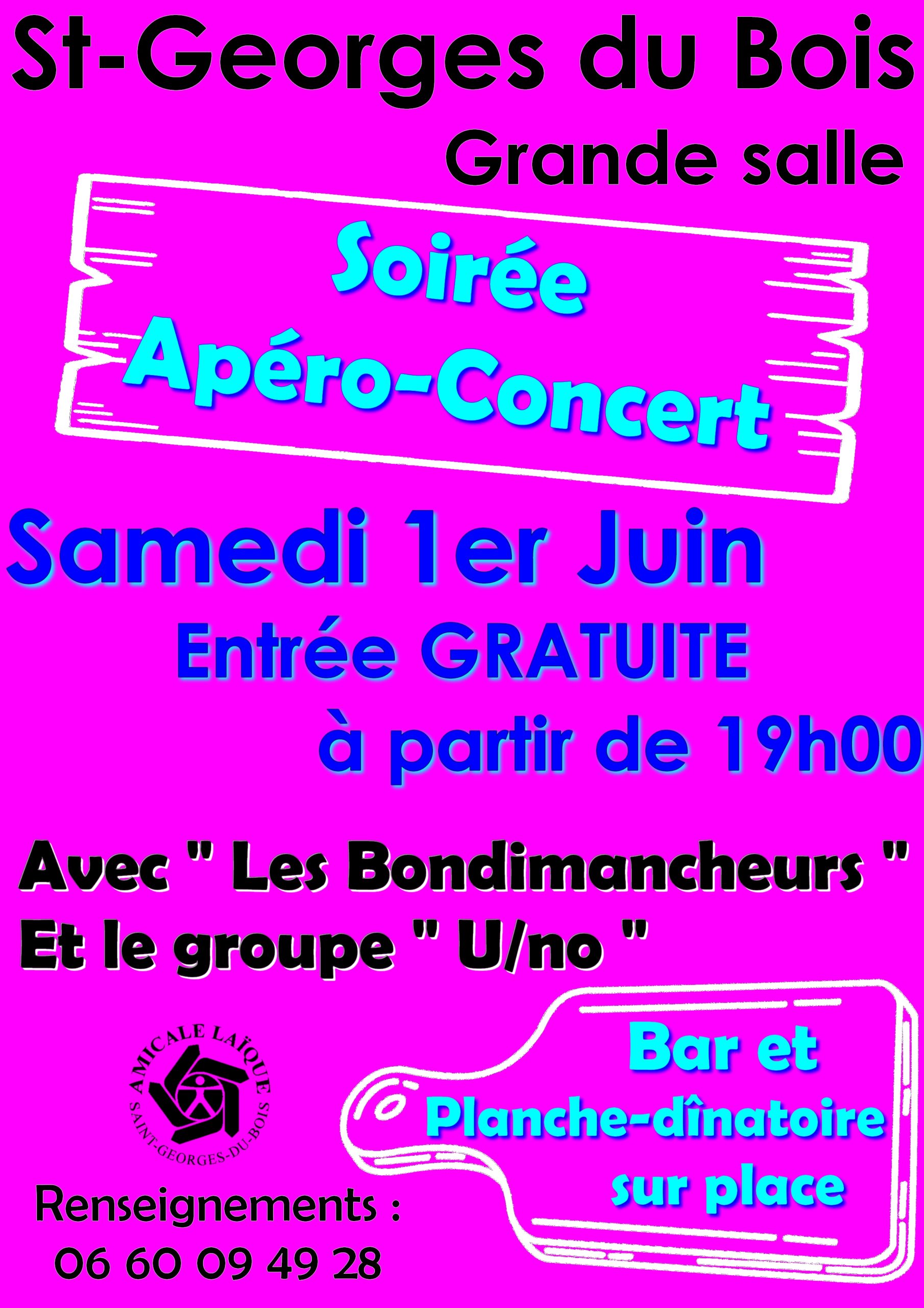 À Saint-Georges-du-Bois, l’Amicale laïque organise une soirée apéro-concert samedi 1er juin, dans la grande salle, à partir de 19h. Elle sera animée par Les Bondimancheurs et le groupe U/no. Entrée gratuite. Bar et planche dînatoire sur place. Renseignements au 06 60 09 49 28.