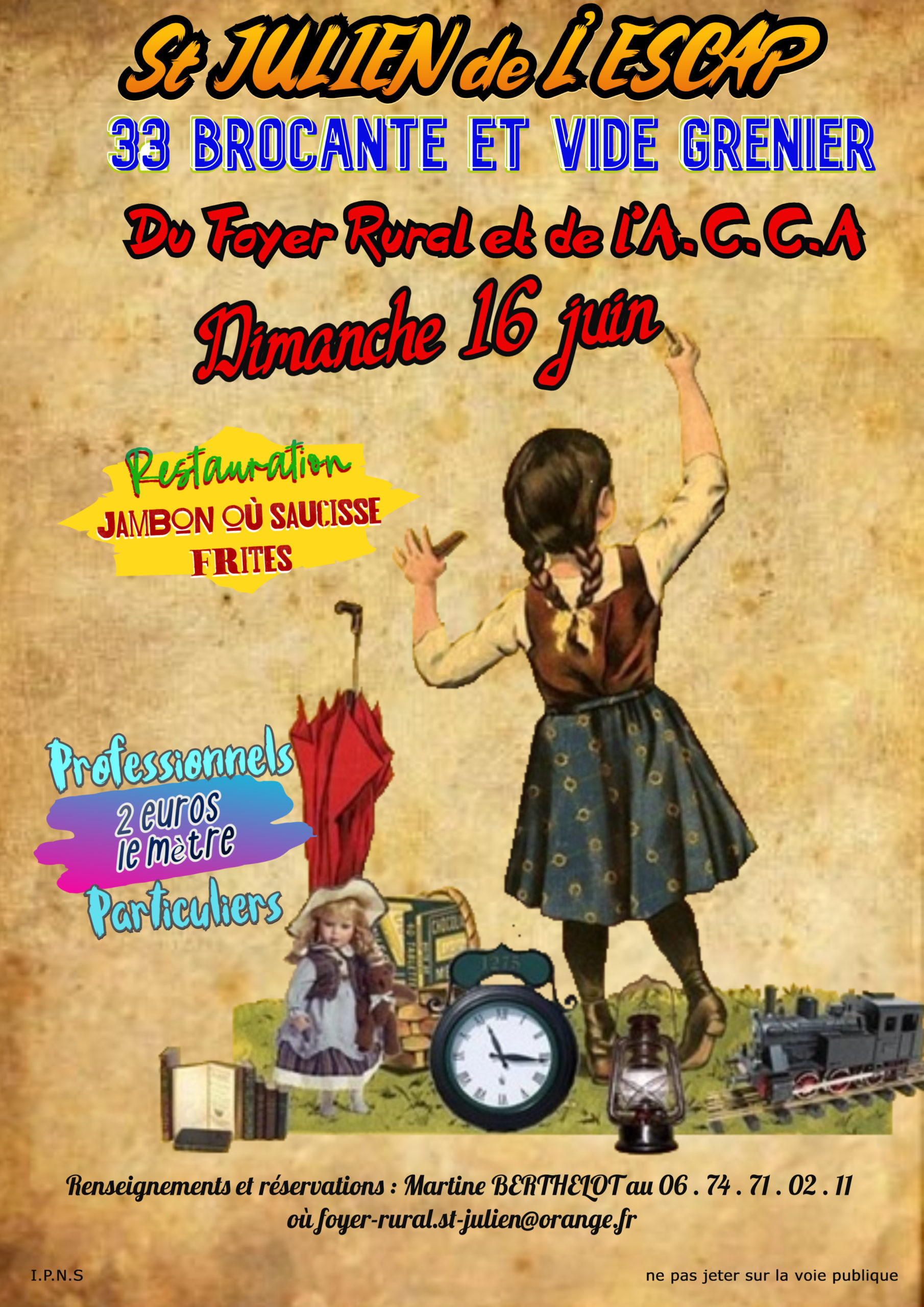 À Saint-Julien-de-l’Escap, le Foyer rural et l’A.C.C.A. organisent leur 33ème brocante et vide-greniers dimanche 16 juin. 2€ le mètre, professionnels et particuliers. Sur place : restauration avec jambon ou saucisses frites. Renseignements et réservations au 06 74 71 02 11 et sur foyer-rural.stjulien@orange.fr.