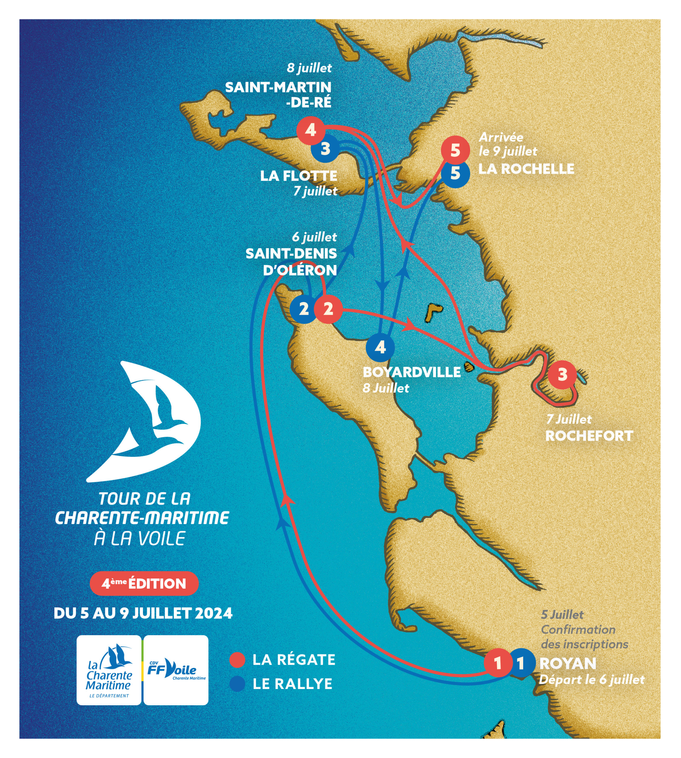 Le Tour de la Charente-Maritime à la voile revient pour une 4e édition. Du 5 au 9 juillet, ce grand rendez-vous nautique organisé par le Département de la Charente-Maritime, avec le soutien du Comité départemental de voile 17, propose deux parcours : la régate, une course en compétition ; ou le rallye pour une navigation de loisir, sans classement. 45 bateaux participent cette année. Après le départ de Royan ce vendredi, cap sur Saint-Denis-d’Oléron, puis Rochefort, Saint-Martin-de-Ré et arrivée à La Rochelle mardi pour la régate.