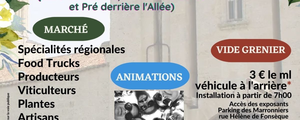 À Surgères, le Comité des fêtes organise son marché du terroir (spécialités régionales, food-trucks, producteurs, viticulteurs, plantes et artisans) et son vide-greniers dimanche 1er septembre, de 9h à 18h, derrière le château. 3€ le mètre linéaire pour le vide-greniers, avec véhicule à l’arrière. Installation à partir de 7h. Animations avec le Quintet de saxophone et le groupe Tempométis ; maquillage enfants. Restauration et buvette sur place. Tables et bancs à disposition. Apportez-vos couverts. Renseignements pour le vide grenier au 06 33 27 32 79 et pour le marché au 06 80 28 72 41.