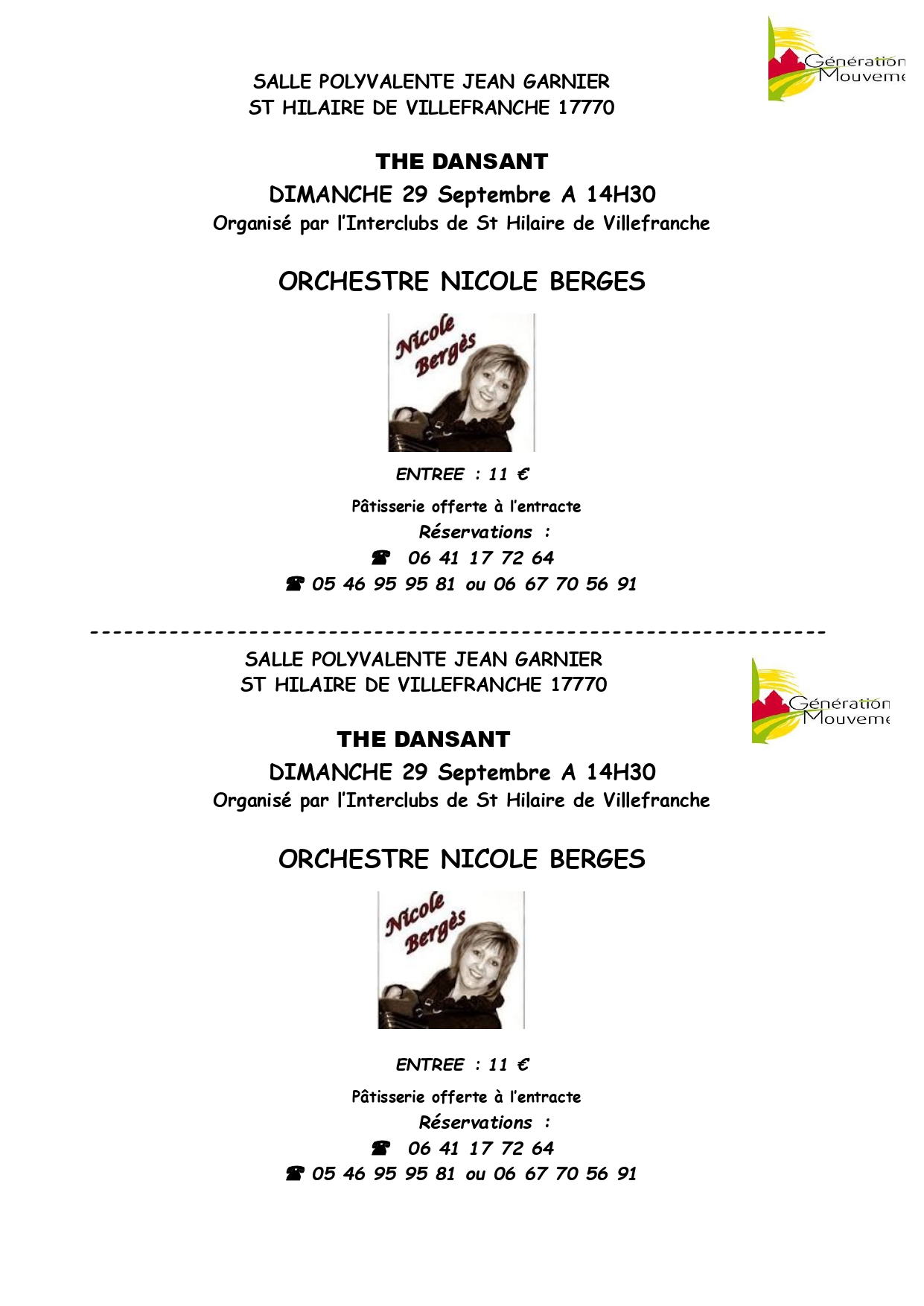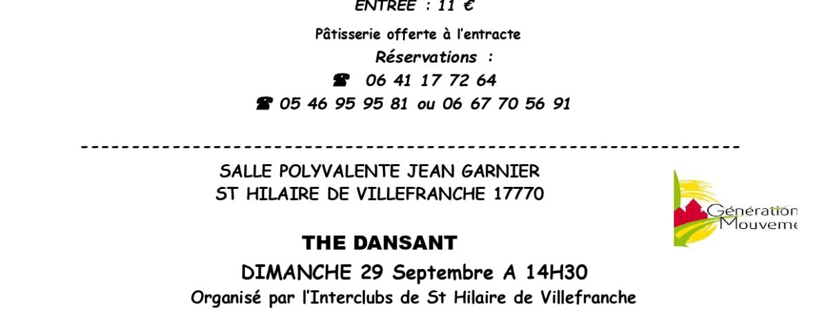 À Saint-Hilaire-de-Villefranche, l’Interclubs génération mouvement organise un thé dansant dimanche 29 septembre, à la salle polyvalente Jean-Garnier, à 14h30. Il sera animé par l’orchestre de Nicole Bergès. L’entrée est à 11€ avec une pâtisserie offerte à l’entracte. Renseignements et réservations au 06 41 17 72 64 ou au 06 67 70 56 91.