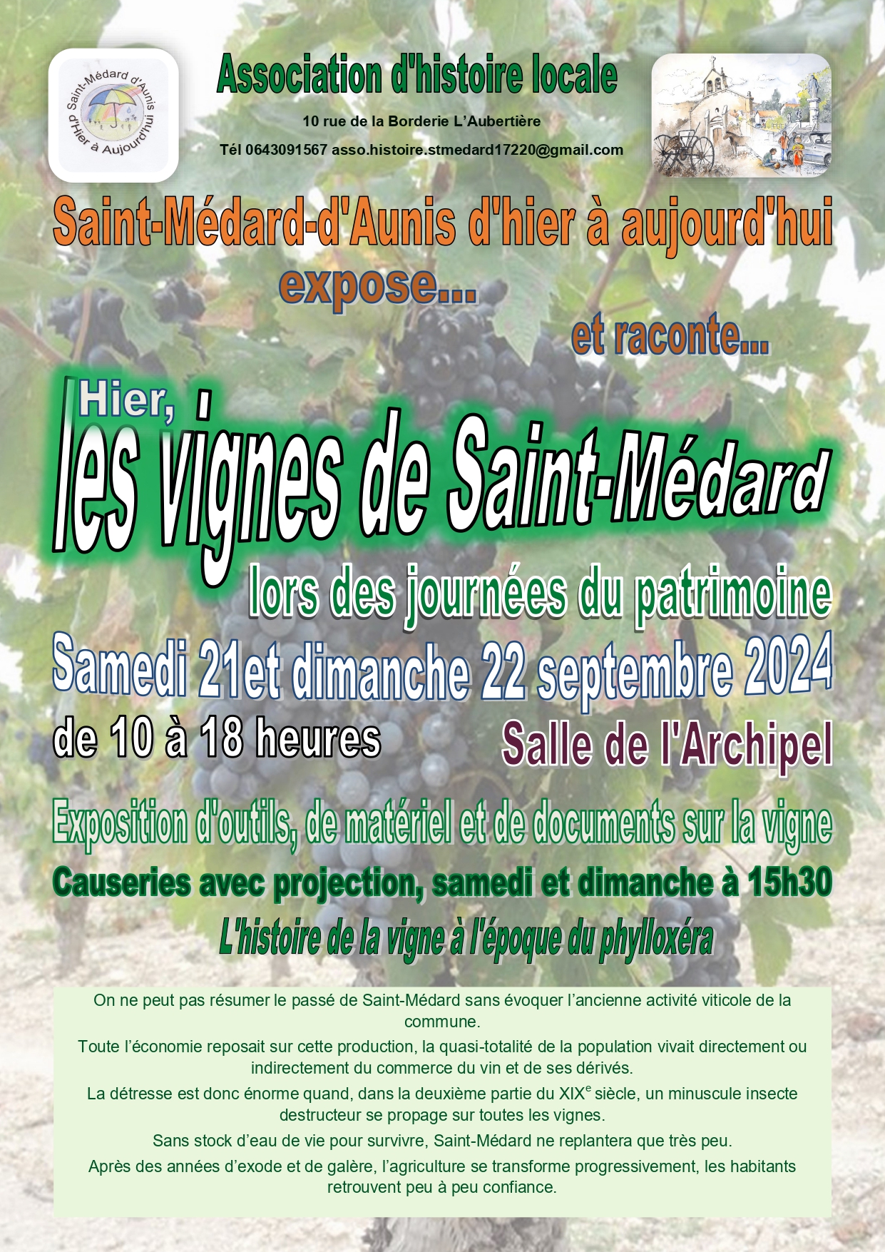 À Saint-Médard-d’Aunis, l’Association d’histoire locale Saint-Médard-d’Aunis d’hier et d’aujourd’hui expose et raconte « Hier, les vignes de Saint-Médard » samedi 21 et dimanche 22 septembre, à la salle de l’archipel, de 10h à 18h, lors des Journées du patrimoine. Sur place : exposition d’outils, de matériels et de documents sur la vigne. Causerie avec projection, samedi et dimanche à 15h30 « L’histoire de la vigne à l’époque du phylloxéra ». Renseignements aux 06 43 09 15 67.
