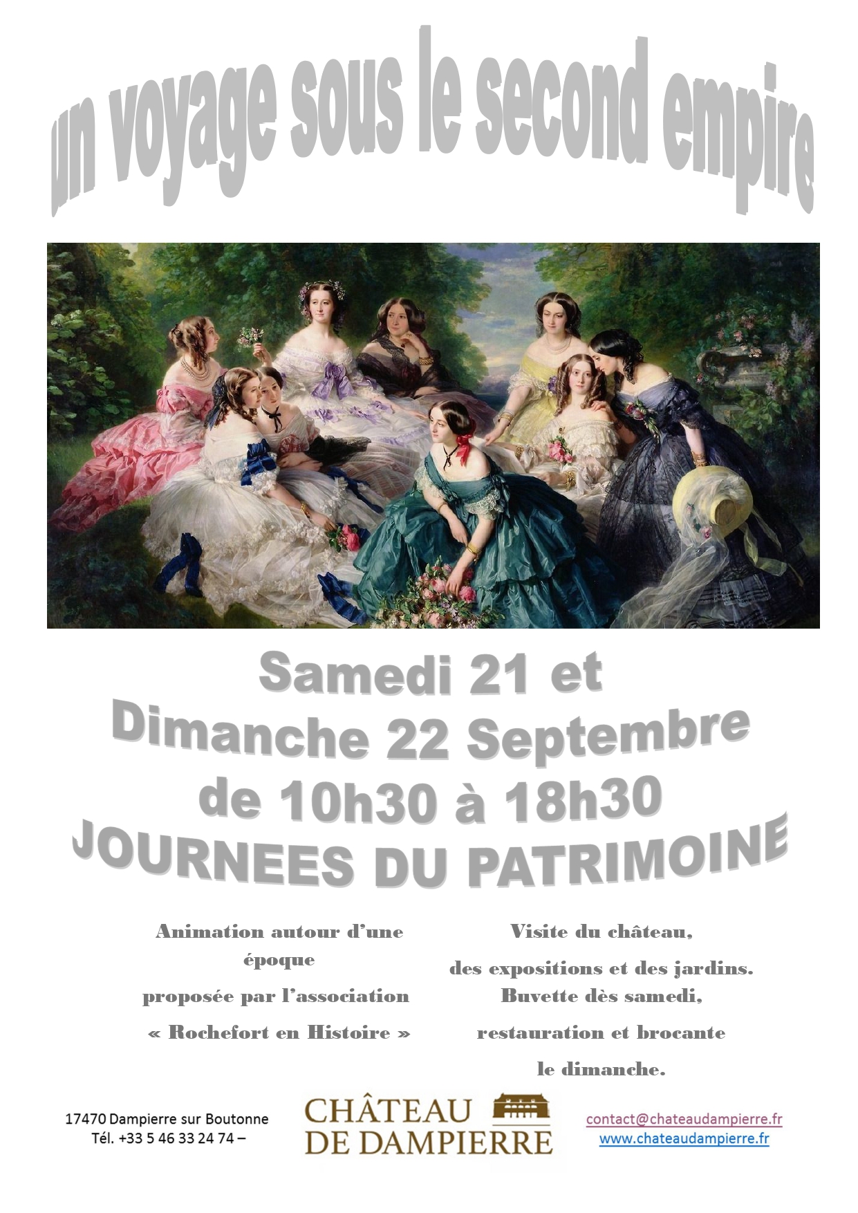 Les samedi 21 et dimanche 22 septembre, à l’occasion des Journées du Patrimoine, le Château de Dampierre-sur-Boutonne vous invite à un voyage sous le Second empire. Rendez-vous de 10h30 à 18h30. Visite du château, des expositions et des jardins, animations diverses et buvette les deux jours. Restauration sur place et brocante. Renseignements au 05 46 33 24 74 et sur chateaudampierre.fr.