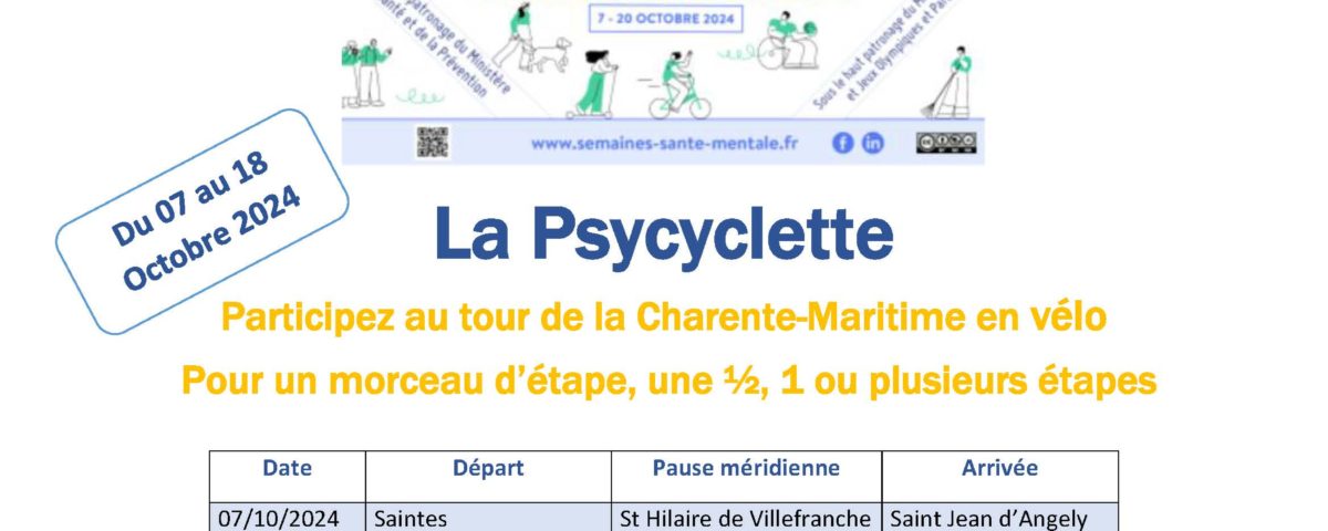 C’est ce lundi que débutent les Semaines d’information sur la santé mentale. À cette occasion, le Groupement de coopération en santé mentale de Charente-Maritime organise le Psycyclette. Un tour du département à vélo qui a pour but de sensibiliser la population à la question des maladies psychiques, et de briser les tabous qui les entourent encore aujourd’hui. C’est l’idée développée par Sylvie Rayé, coordinatrice du Projet territorial de santé mentale en Charente-Maritime. Écoutez :