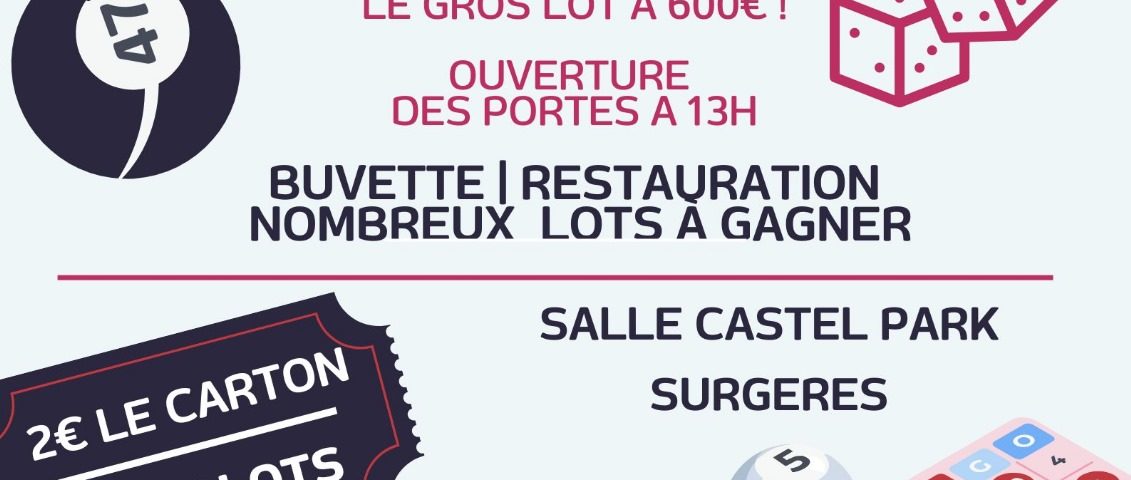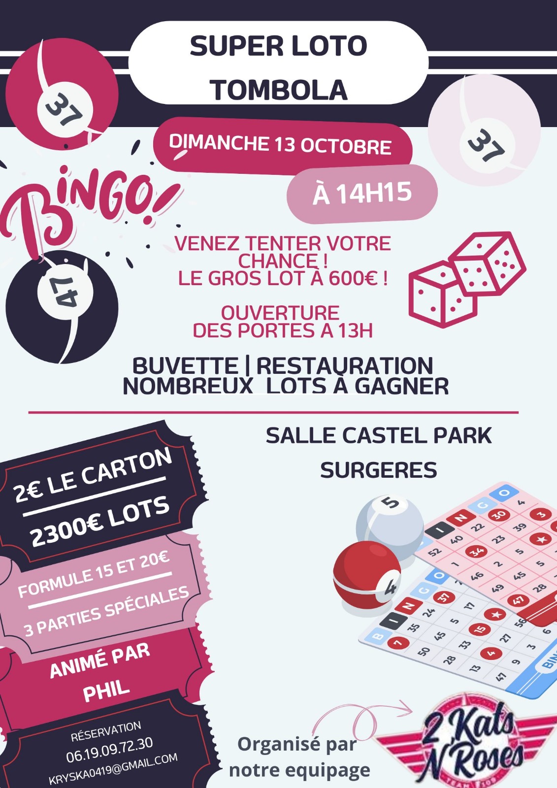 À Surgères, l’association 2 kats n’roses organise un loto tombola dimanche 13 octobre, à la salle du Castel Park, à 14h15. Il sera animé par Phil. Gros lot à 600€ et de nombreux lots à gagner pour un total de 2 300€. 2€ le carton. Formule à 15 et 20€. 3 parties spéciales. Sur place buvette et restauration. Renseignements et réservation au 06 19 09 72 30. Ouverture des portes à 13h.