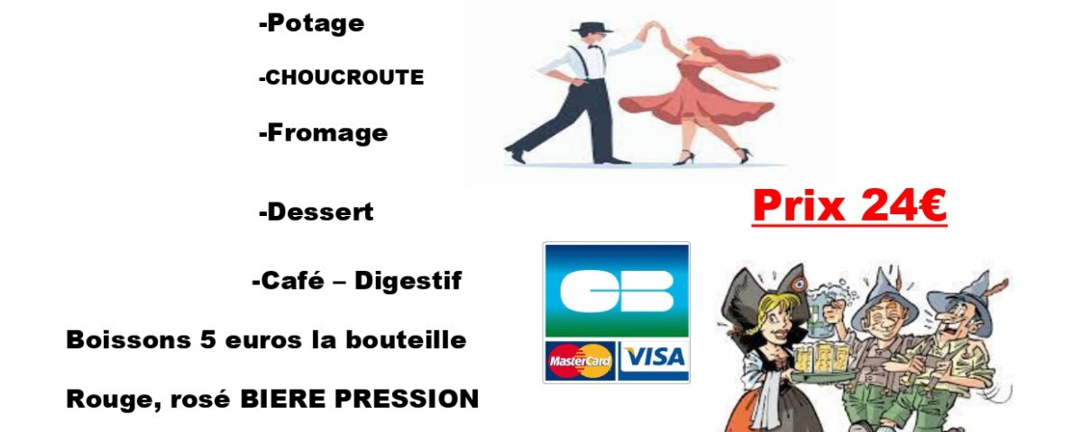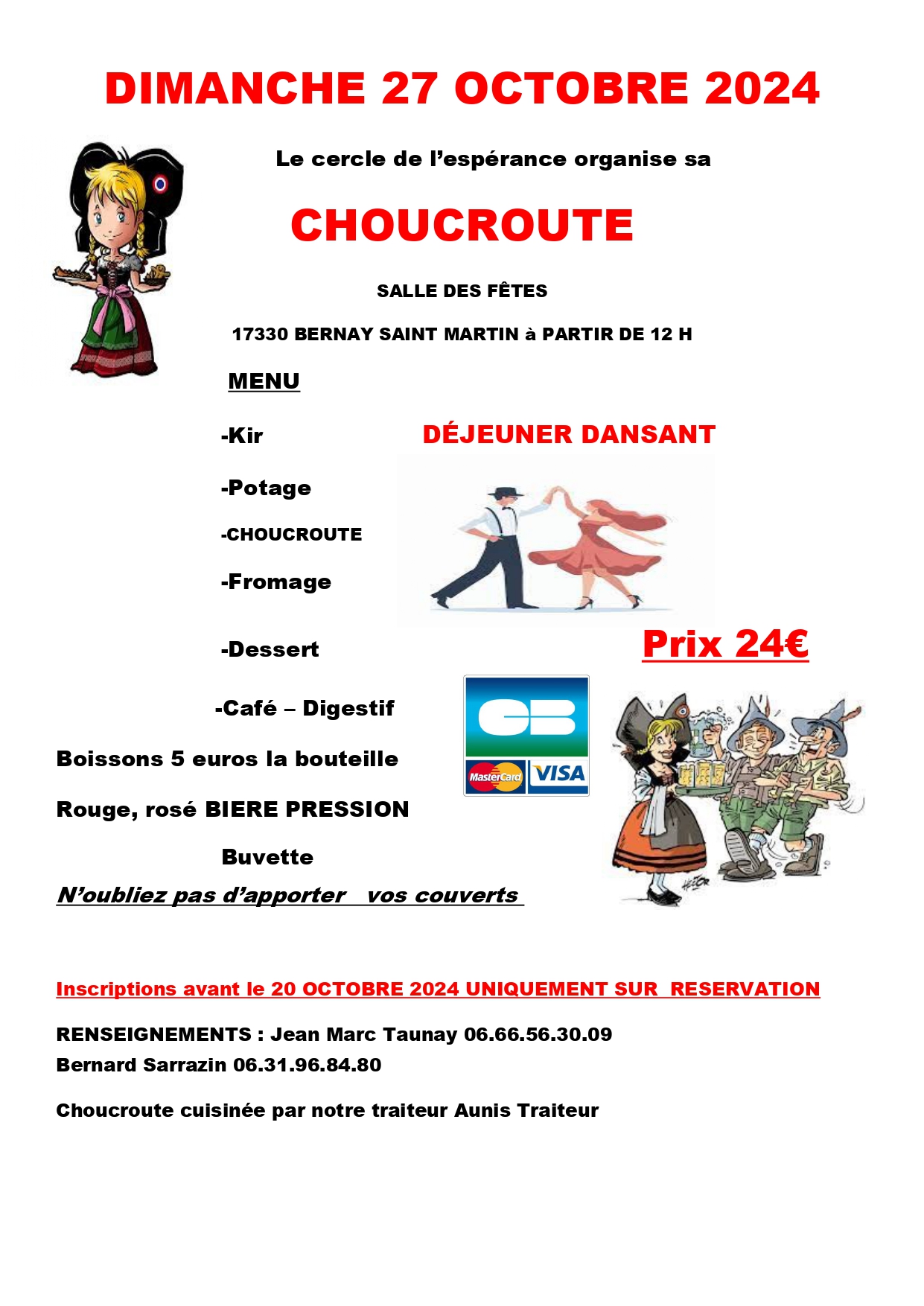À Bernay-Saint-Martin, le Cercle de l’espérance organise un repas choucroute dimanche 27 octobre, à partir de 12, à la salle des fêtes. Au menu à 24€ : kir, potage, choucroute, fromage, dessert, café et digestif. Vin rouge et rosé non compris 5€ la bouteille. Buvette et bière pression. Apportez vos couverts. Inscription avant le 20 octobre au 06 66 56 30 09 ou au 06 31 96 84 80. Carte bancaire acceptée. L’abus d’alcool est dangereux pour la santé à consommer avec modération.
