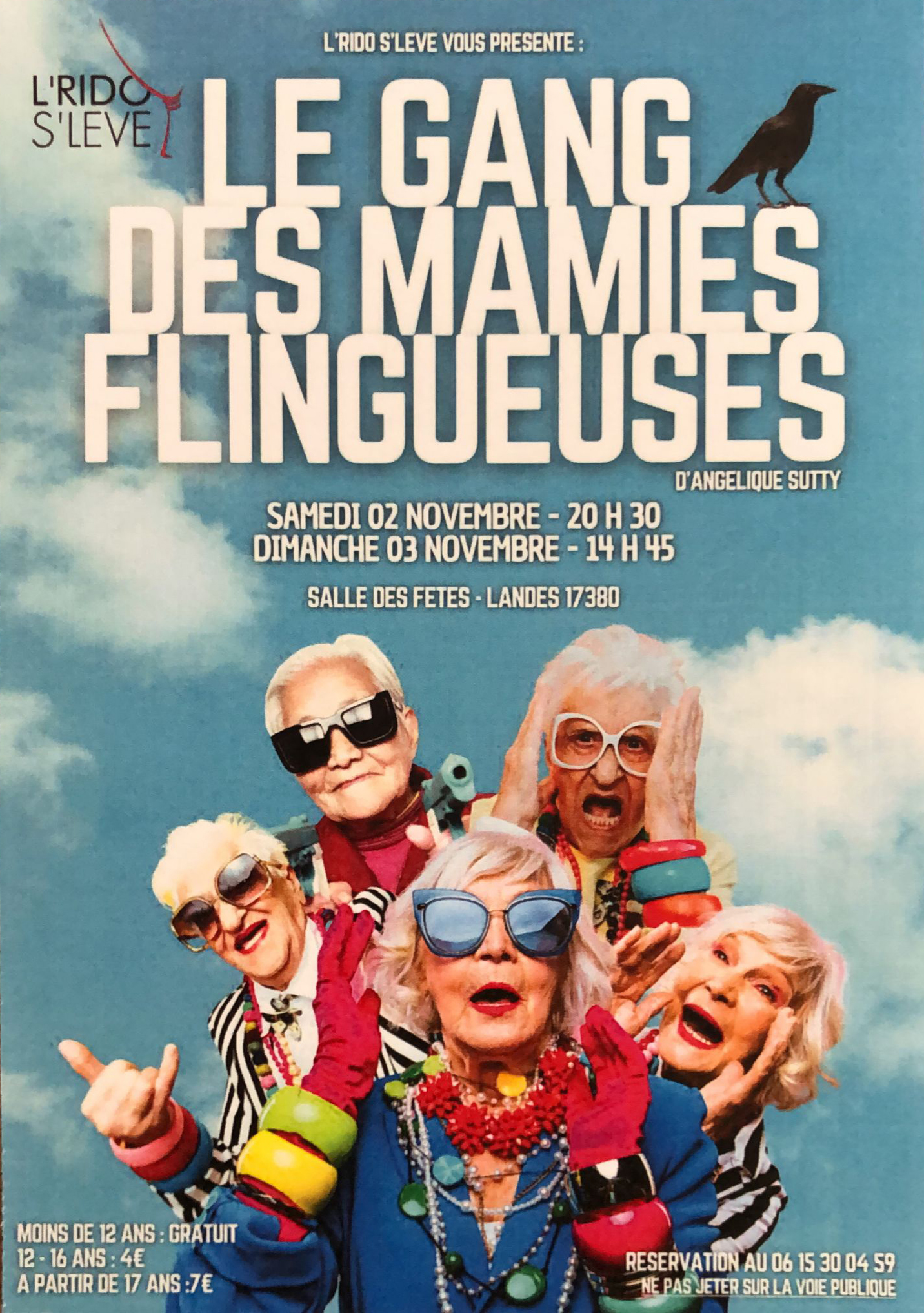 À Landes, la compagnie L’rido s’lève présente « Le gang des mamies flingueuses », une pièce de théâtre d’Angélique Sutty, samedi 2 novembre, à 20h30, et dimanche 3 novembre, à 14h45, à la salle des fêtes. Entrée 7€ à partir de 17 ans, 4€ pour les 12 – 16 ans et gratuit pour les moins de 12 ans. Réservations au 06 15 30 04 59. Ouverture des portes le samedi à 20h et le dimanche à 14h.