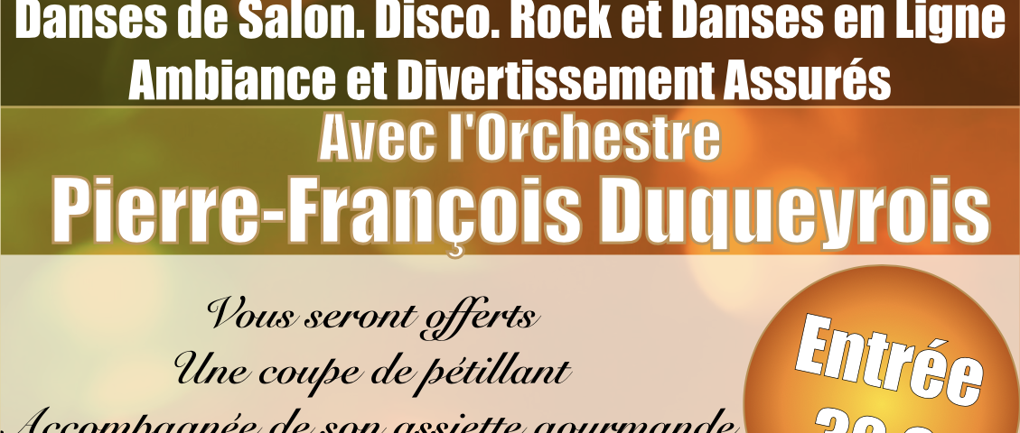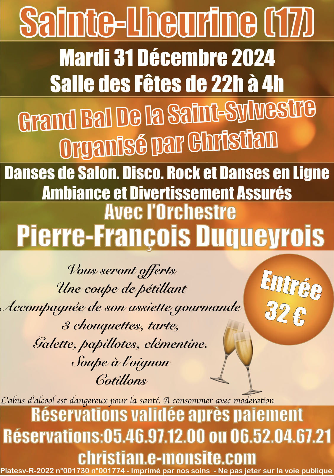 Christian organise à la salle des fêtes de Sainte-Lheurine, mardi 31 décembre, de 22h00 à 4h00, un grand bal de la Saint-Sylvestre avec l’orchestre de Pierre-François Duqueyrois. Vous seront offerts une coupe de pétillant accompagnée de son assiette gourmande composée de 3 chouquettes, tarte, galette, papillotes, clémentine, soupe à l’oignon et cotillons. Ambiance et divertissement assurés. L’entrée est à 32 euros. Réservation validée après paiement. Réservez en appelant le 05 46 97 12 00 ou le 06 52 04 67 21 et sur christian.e-monsite.com. L’abus d’alcool est dangereux pour la santé, à consommer avec modération.