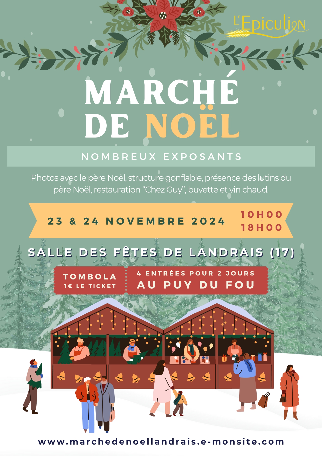 À Landrais, l’association L’Épiculien organise son marché de Noël samedi 23 et dimanche 24 novembre, à la salle des fêtes, de 10h à 18h. Sur place de nombreux exposants, photos avec le Père Noël et présence de ses lutins, structure gonflable, restauration, buvette et vin chaud. Tombola à 1€ le ticket pour gagner 4 entrées pour 2 jours au Puy du fou. Renseignements sur marchedenoellandrais.e-monsite.com. L’abus d’alcool est dangereux pour la santé à consommer avec modération.