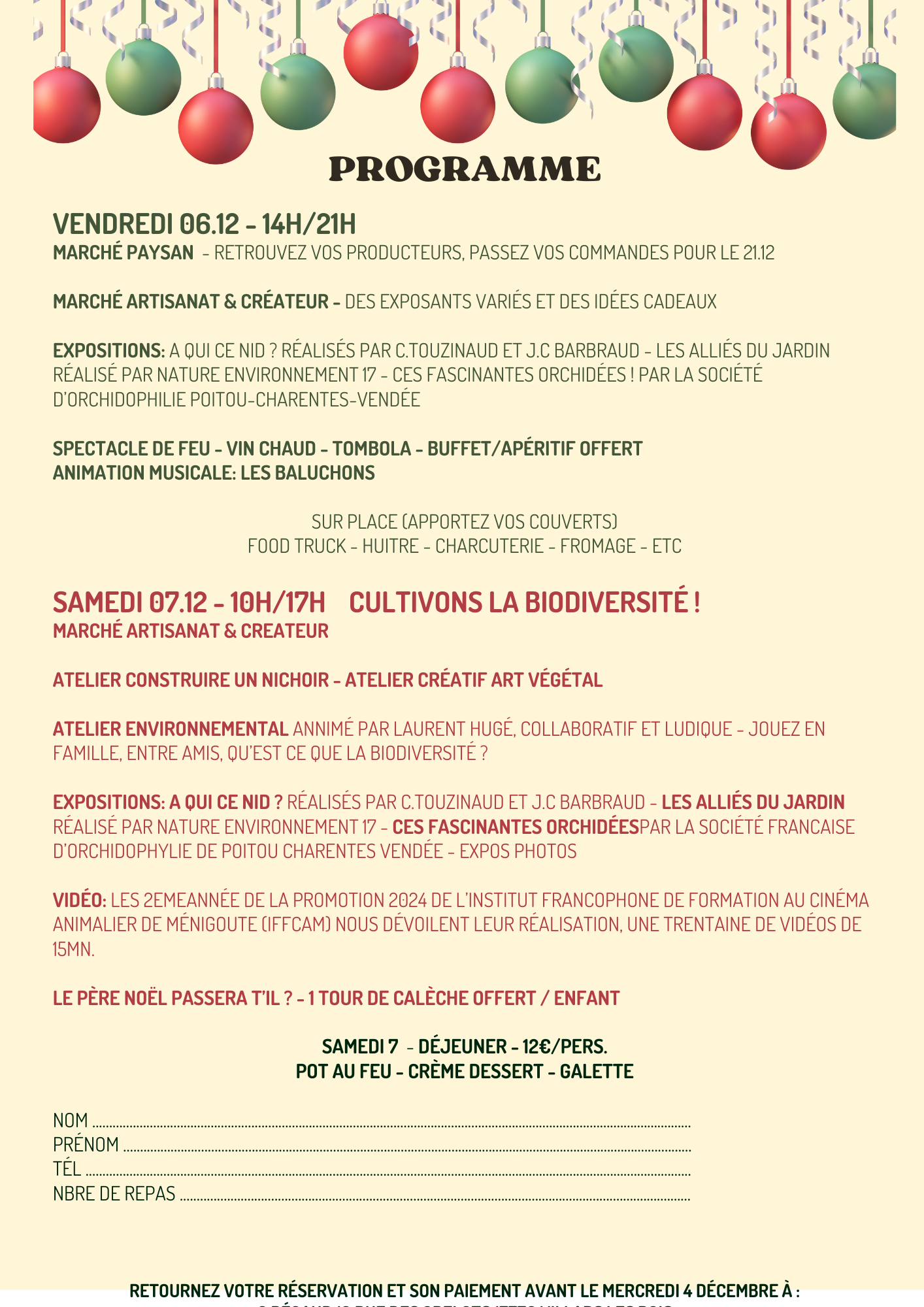 À Villars-les-Bois, l’association Arts-Terre organise un marché paysan, artisanat et créateur vendredi 6 décembre, de 14h à 21h, et samedi 7 décembre, de 10h à 17h. Sur place de nombreux exposants, exposition « À qui ce nid ? » et vidéo. Le vendredi : food-truck, huîtres, charcuterie, buffet et apéritif offert, vin chaud, spectacle de feu, animation musicale avec Les Baluchons et tombola. Apportez vos couverts. Le samedi : déjeuner à 12€ par personne avec pot eu feu, crème dessert et galette. Présence du père Noël et un tour de calèche offert par enfant. L’abus d’alcool est dangereux pour la santé, à consommer avec modération.