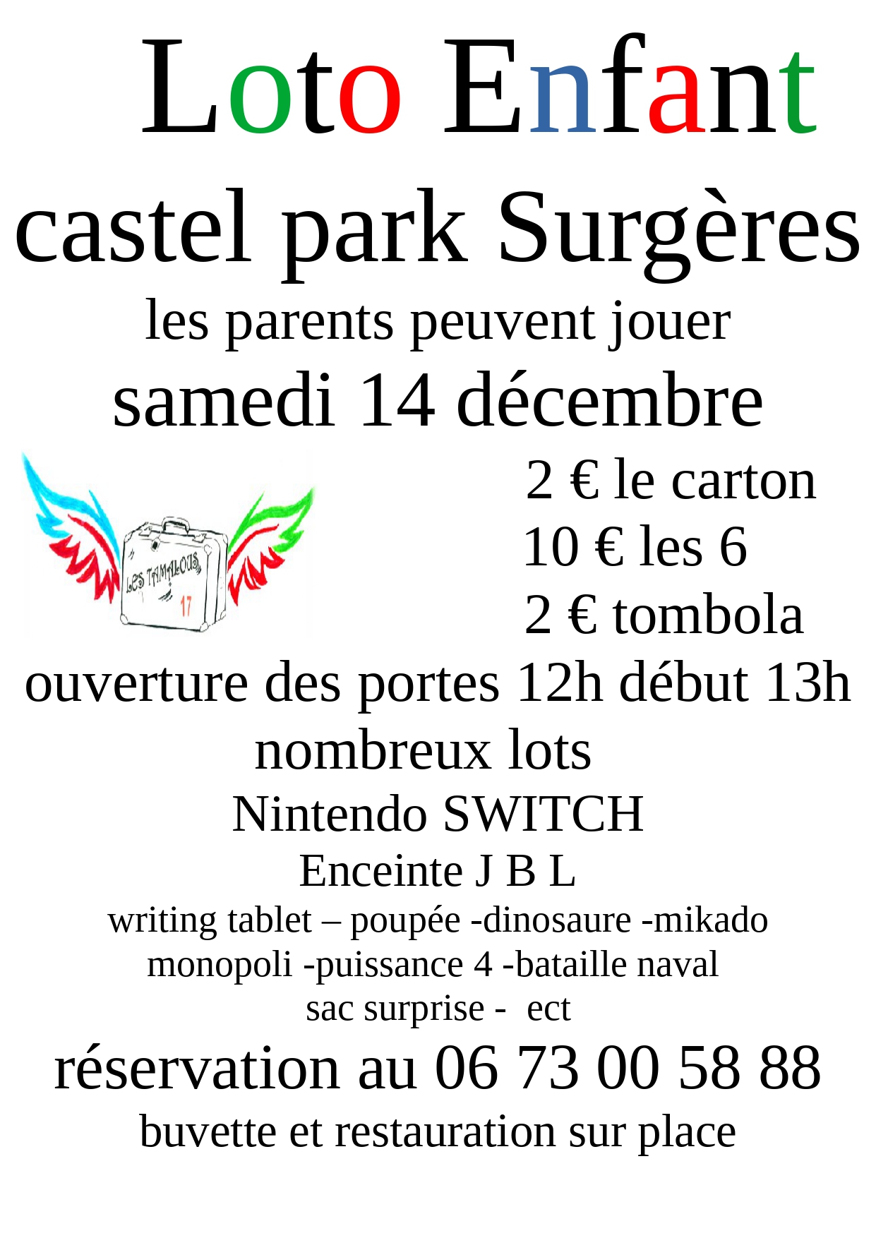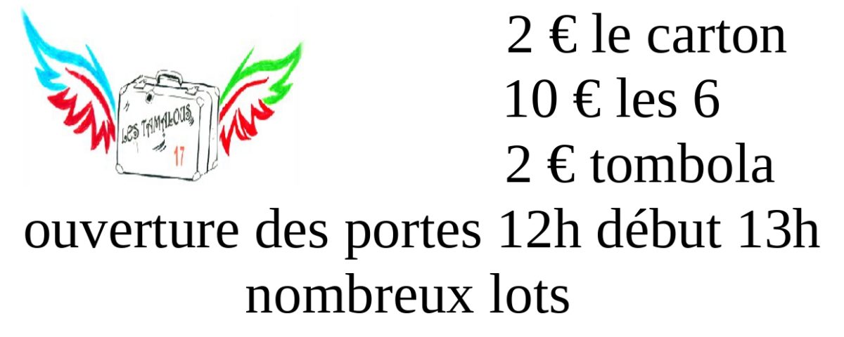 À Surgères, l’association Les Tamalous 17 organise un loto enfant samedi 14 décembre, à 13h, à la salle du Castel Park. Les parents peuvent jouer. À gagner : une Nintendo Switch, une enceinte JBL, une writing tablet, poupée, dinosaure, Monopoly et de nombreux autres lots. 2€ le carton, 10€ les 6. Tombola à 2€. Buvette et restauration sur place. Réservation au 06 73 00 58 88. Ouverture des portes à midi. Il sera suivi d’un loto adulte le soir.