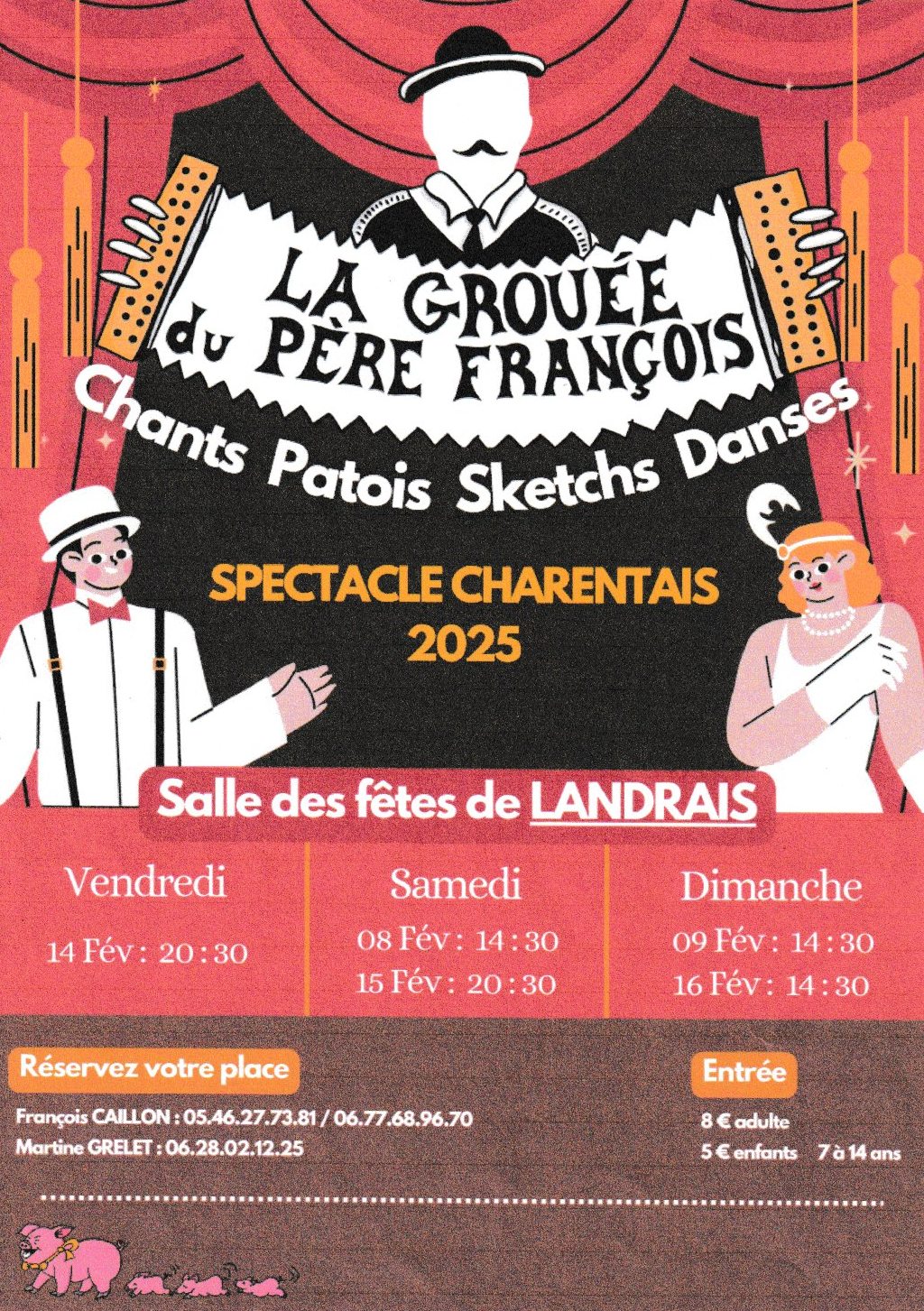 Rendez-vous à la salle des fêtes de Landrais, pour le nouveau spectacle charentais « La grouée du père François » samedi 8 février et dimanche 9 février, à 14h30, ainsi que vendredi 14 février et samedi 15 février à 20h30, et dimanche 16 février, à 14h30. Au programme : des sketchs, du patois, des chants et de la danse. Tarif adulte 8€ et 5€ pour les enfants de 7 à 14 ans. Réservez votre place en téléphonant au 05 46 27 73 81 ou au 06 77 68 96 70.