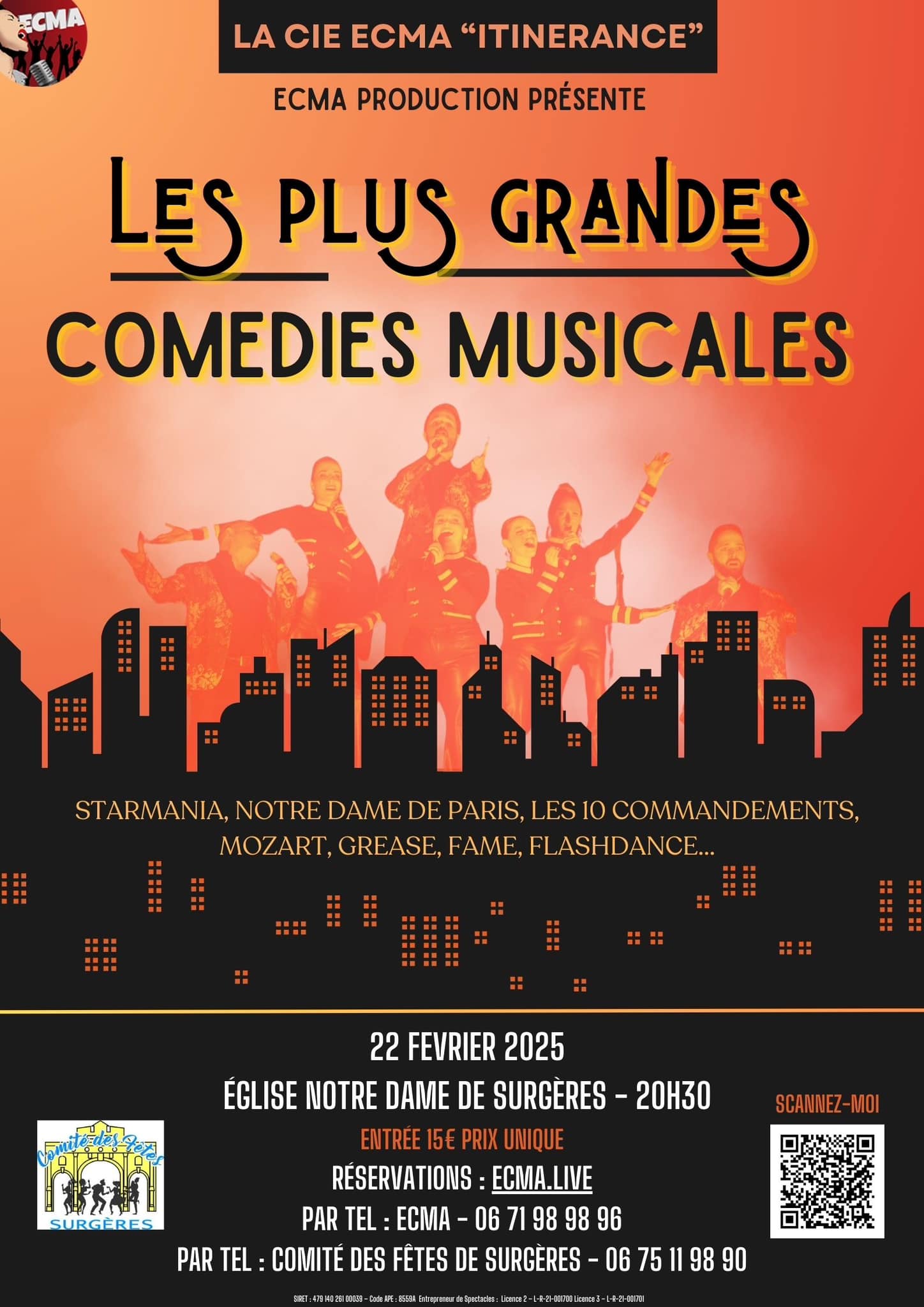La compagnie ECMA Itinérance présente « Les plus grandes comédies musicales » samedi 22 février, en l’église Notre-Dame de Surgères, à 20h30. Au programme de ce spectacle, organisé par le Comité des fêtes, les plus grands titres de Starmania, Notre-Dame de Paris, Les 10 commandements, Mozart, Grease et bien d’autres. Entrée prix unique 15€. Renseignements et réservations au 06 75 11 98 90 ou au 06 71 98 98 96 et sur Helloasso.