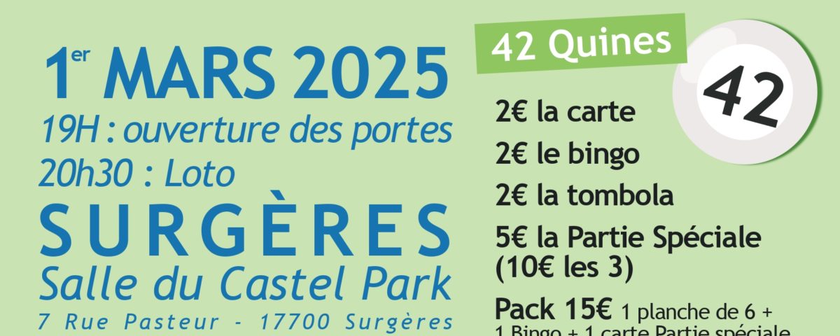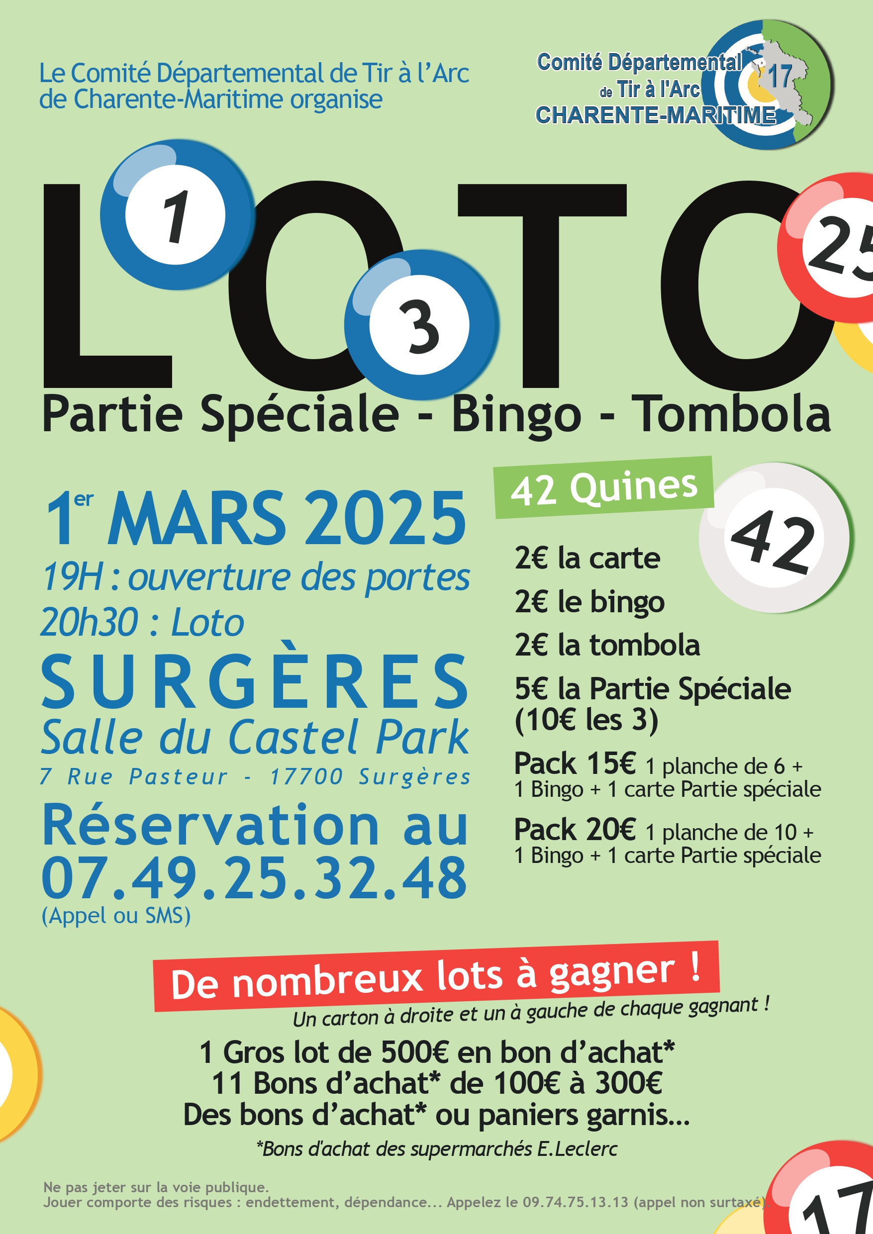 À Surgères, le Comité Départementale de tir à l’arc de Charente-Maritime organise un loto samedi 1er mars, à 20h30, à Castel Park. 42 quines. De nombreux lots à gagner dont un gros lot de 500€ en bon d’achat, 11 bons de 100 à 300€ et des paniers garnis. Un carton offert à droite et à gauche de chaque gagnant. Le carton, le bingo ou la tombola sont à 2€. 5€ la partie spéciale, 10€ les 3. Pack à 15 et 20€. Réservations conseillées au 07 49 25 32 48. Ouvertures des portes à 19h.