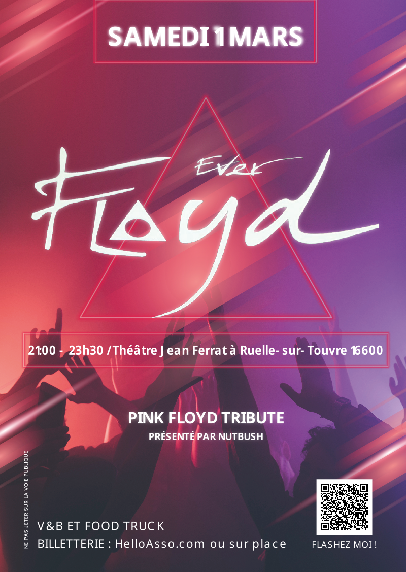 Rendez-vous au spectacle « Ever Floyd » samedi 1er mars, au théâtre Jean-Ferrat, à Ruelle-Sur-Touvre, en Charente, à 21h. Vivez un voyage dans la galaxie Pink Floyd. Un spectacle immersif qui allie son, lumière et vidéo, et qui promet une expérience inoubliable pour tous les fans des Pink Floyd. Billetterie sur Helloasso ou sur place. Buvette et Food truck.