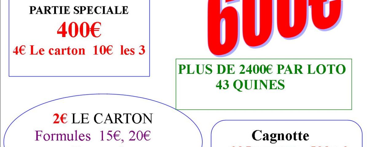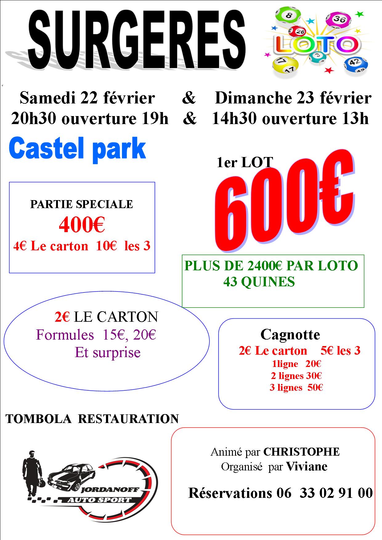 À Surgères, l’association Jordanoff auto sport organise deux lotos samedi 22 février, à 20h30, et dimanche 23 février, à 14h30, à Castel Park. Il sera animé par Christophe et préparé par Viviane. 43 quines. 1er lot à 600€. 2€ le carton, formule à 15 et 20€ et surprise. Partie spéciale à 4€ le carton et 10€ les 3 pour un lot de 400€. Cagnotte à 2€ et 5€ les 3 pour de lots de 20, 30 et 50€. Sur place tombola et restauration. Renseignements et réservations au 06 33 02 91 00. Ouverture des portes le samedi à 19h et le dimanche à 13h.
