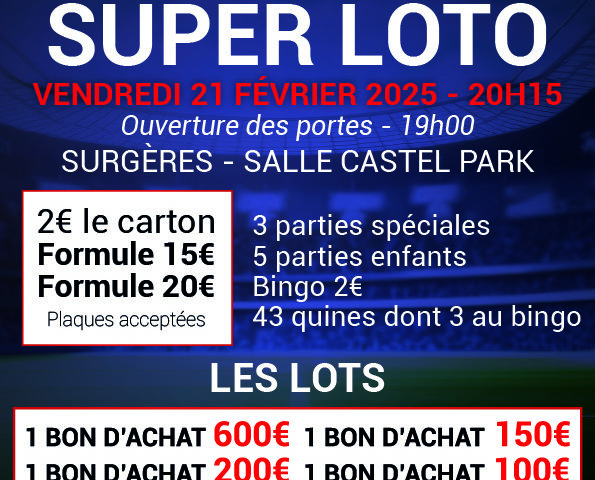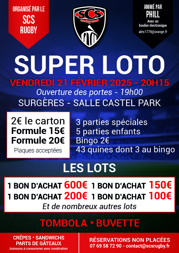 À Surgères, le SCS rugby organise un loto vendredi 21 février, à 20h15, à Castel Park. Il sera animé par Phil. 43 quines dont 3 au bingo. 3 parties spéciales, 5 parties enfants. 2€ le carton, formule à 15 et 20€. Plaques acceptées. À gagner : des bons d’achats de 100 à 600€ et de nombreux autres lots. Tombola et buvette. Crêpes, sandwichs et part de gâteau. Réservations non placées au 07 69 58 72 90 et par mail à contact@scsrugby.fr.