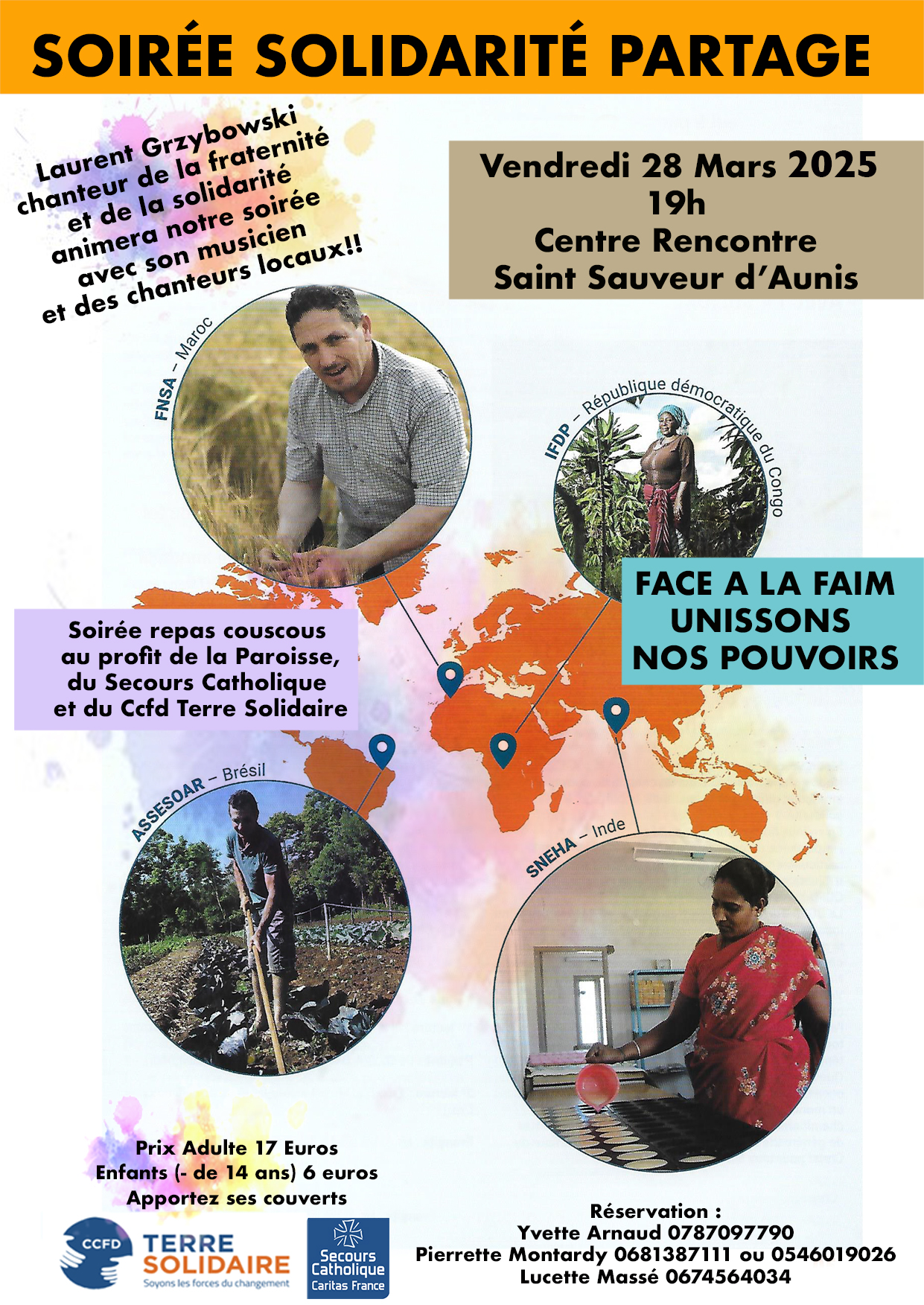 Depuis des années, la soirée Solidarité Partage Couscous est une institution à Saint-Sauveur-d’Aunis. Rendez-vous pour cette grande soirée qui aura lieu vendredi 28 mars, à 19h, au Centre rencontre. Soirée repas couscous au profit de la paroisse, du Secours Catholique et du CCFD Terre solidaire. Laurent Grzybowski, chanteur de la fraternité et de la solidarité, animera la soirée avec son musicien et des chanteurs locaux. Tarif adulte 17€, enfant de moins de 14 ans 6€. Apportez vos couverts. Renseignements et réservations au 07 87 09 77 90 ou au 05 46 01 90 26.