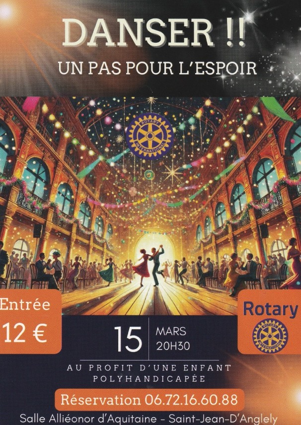 À Saint-Jean-d’Angély, le Rotary club organise une soirée dansante à la salle Aliénor-d’Aquitaine, en faveur d’une jeune enfant qui est polyhandicapée. Rendez-vous samedi 15 mars, à 20h30. C’est animé par SEV. 12€ la soirée. Réservation au 06 72 16 60 88.