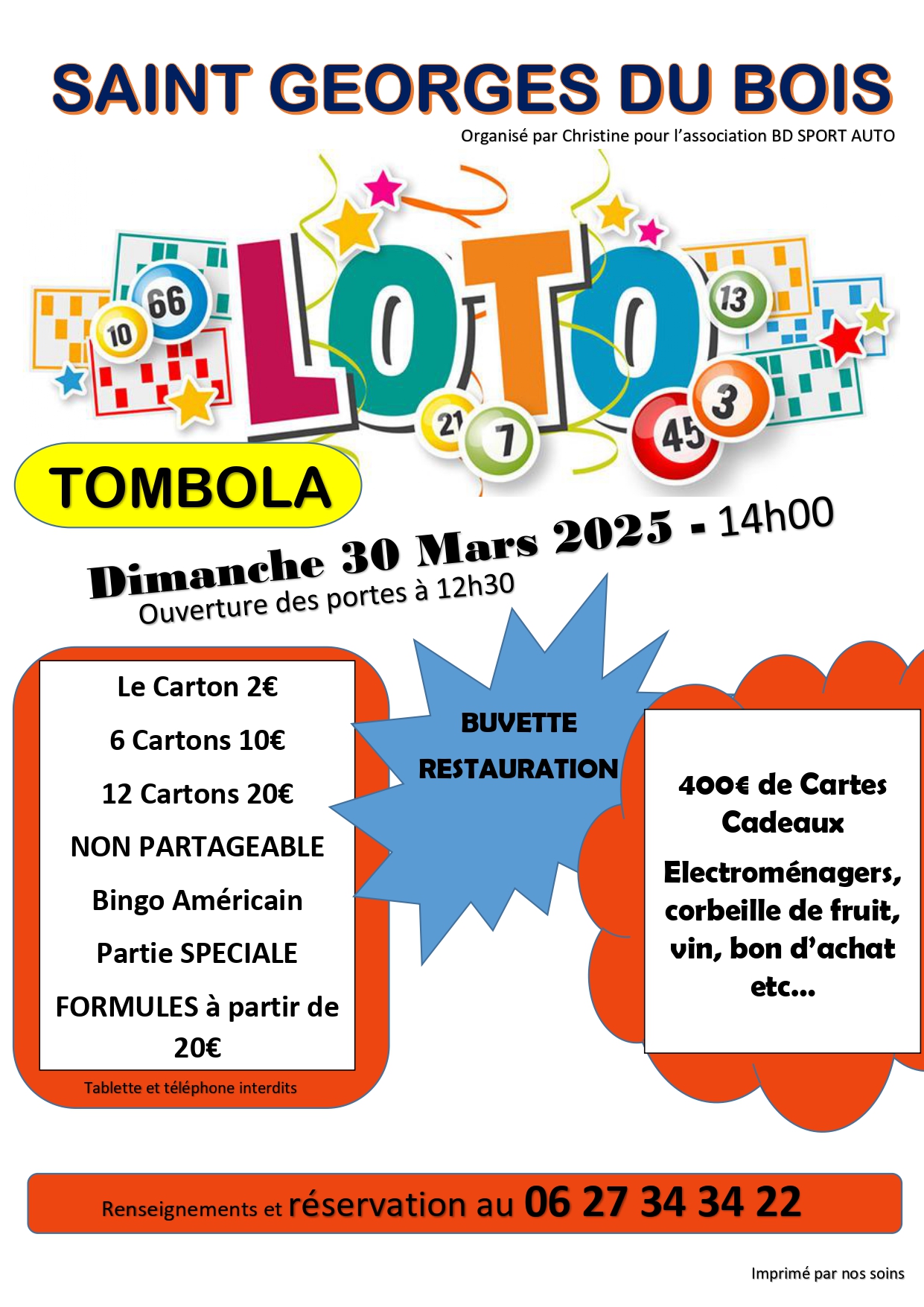 À Saint-Georges-du-Bois, l’association BD sport auto organise un loto dimanche 30 mars, à 14H. À gagner : 400€ de cartes cadeaux, électroménagers, corbeille de fruit, vin, des bons d’achat et de nombreux autres lots. 2€ le carton, 10€ les 6 et 20€ les 12. Formule à partir de 20€. Non partageable. Bingo Américain, partie spéciale et tombola vous seront proposés. Sur place buvette et restauration. Renseignements et réservations au 06 27 34 34 22. Ouverture des portes à 12h30. Tablette et téléphone interdits.