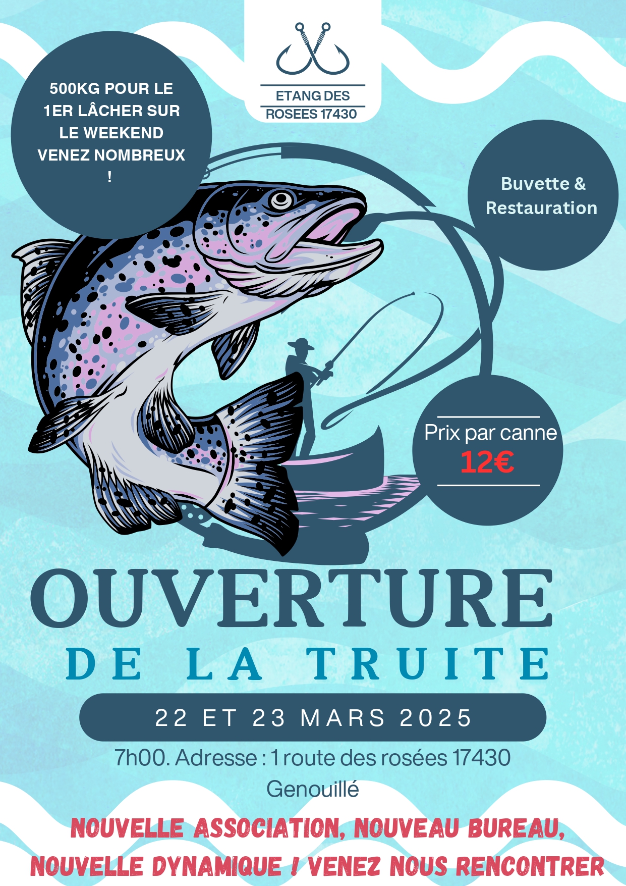 La Gaulle genouillacaise et son nouveau bureau vous donnent rendez-vous à l’étang des rosées samedi 22 et dimanche 23 mars, dès 7h, pour l’ouverture de la pêche à la truite, au 1 route des rosées à Genouillé. 500KG pour le 1er lâcher. Prix par canne 12€. Sur place buvette et restauration.