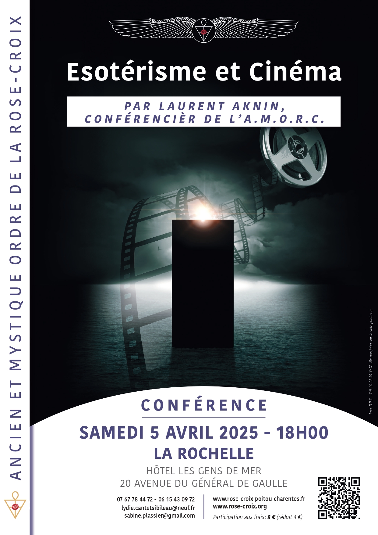 À La Rochelle, une conférence ésotérisme et cinéma par Laurent Aknin, conférencier de l’A.M.O.R.C., est organisée samedi 5 avril, à 18h, à l’hôtel « Les Gens de mer », 20 avenue du Général De Gaulle. Participation 8€ et tarif réduit 4€. Renseignement au 07 67 78 44 72 ou au 06 15 43 09 72.