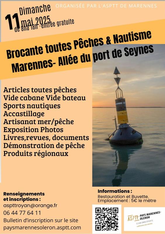 À Marennes-Hiers-Brouage, l’ASPTT organise une brocante entièrement dédiée à la pêche et au nautisme dimanche 11 mai, de 8h à 18h, allée du port de Seynes, le long du canal du Lindron. Ouverte aux particuliers et professionnels, cette brocante rassemblera tout ce qui touche à la pêche eau douce et mer, accastillage, vide bateau, vide cabane, produits régionaux. Emplacement 5€ le mètre. Restauration et buvette sur place. Renseignements et inscriptions au 06 44 77 64 11 et par mail à aspttroyan@orange.fr.