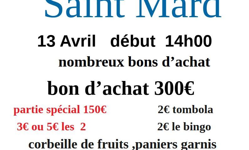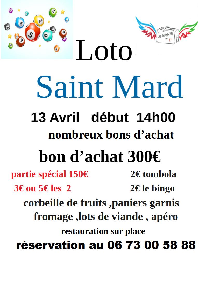 À Saint-Mard, l’association Les Tamalous 17 organise un loto dimanche 13 avril, à 14h. À gagner, de nombreux bons d’achat dont un de 300€, des corbeilles de fruits, paniers garnis, lots de viandes et bien d’autres. Partie spéciale à 3€ ou 5€ les 2 pour un bon de 150€. Tombola et bingo à 2€ chacun. Bar et restauration sur place. Réservations au 06 73 00 58 88.