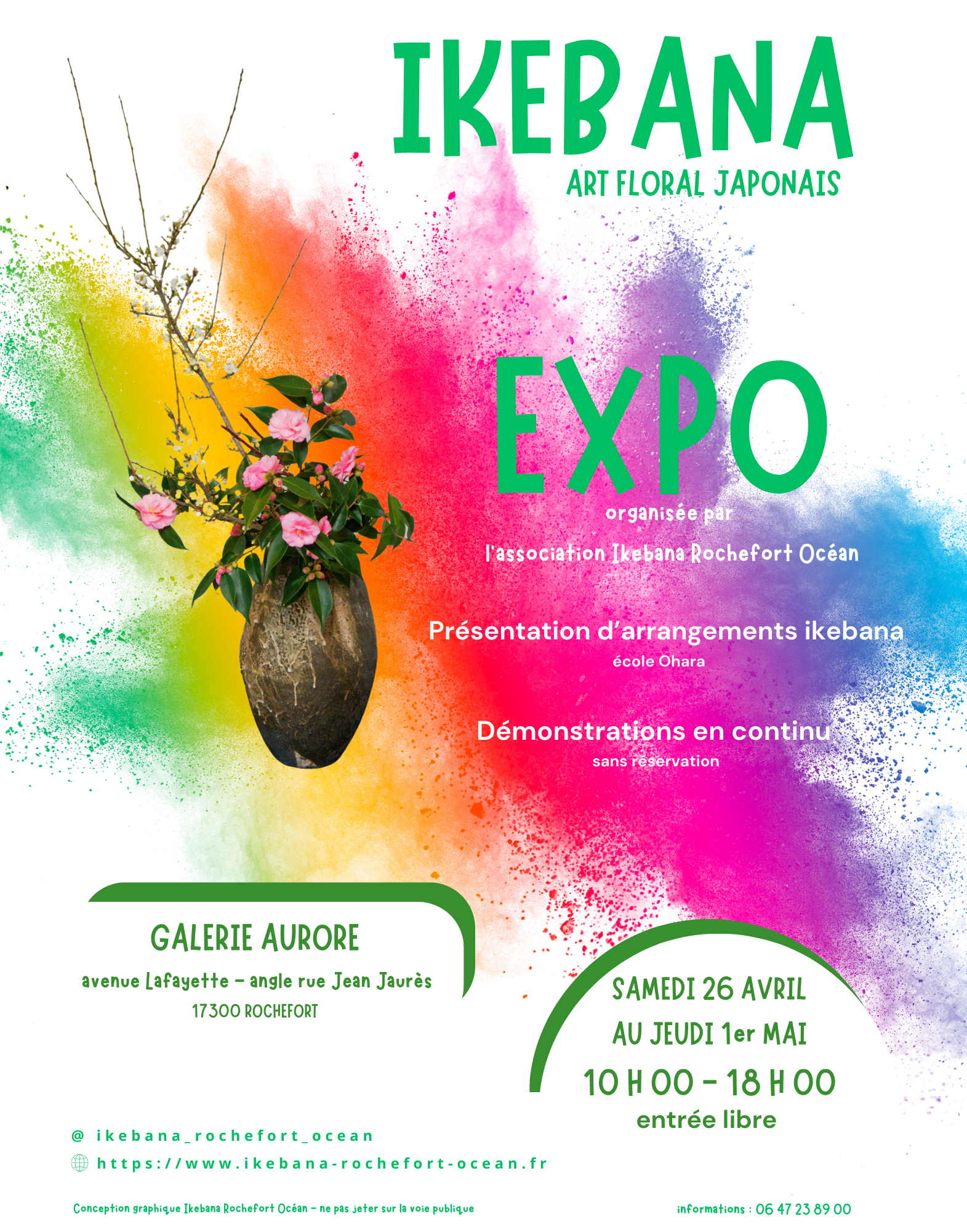 L’association Ikebana Rochefort océan vous invite à venir découvrir l’ikebana, art floral japonais, à la Galerie Aurore de Rochefort, à l’angle de l’avenue Lafayette et de la rue Jean-Jaurès, du samedi 26 avril au jeudi 1er mai. Sur place, exposition, présentation d’arrangement ikebana et démonstration en continu. L’entrée est libre et ouvert de 10h à 18h. Renseignements au 06 47 23 89 00.