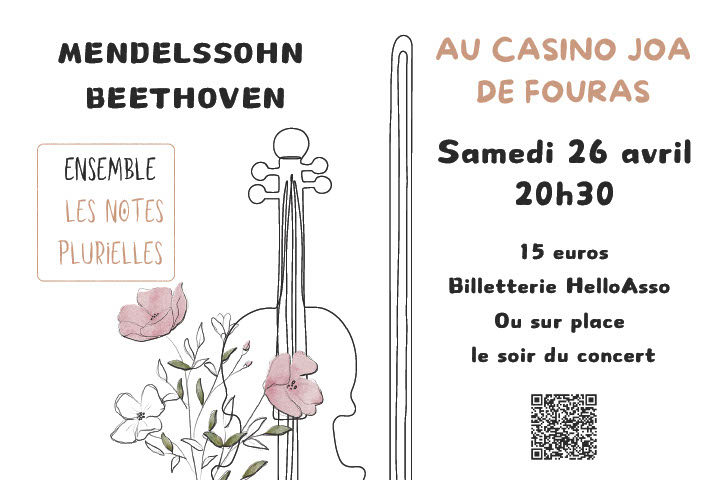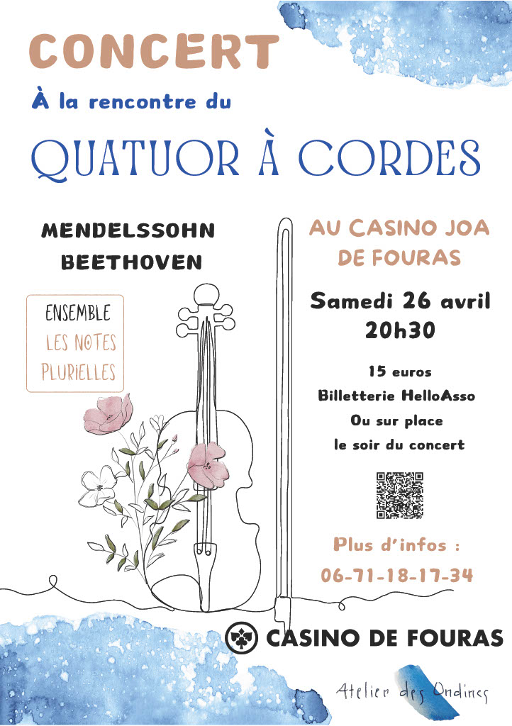 À Fouras, l’Atelier des ondines organise un concert à la rencontre du Quatuor à cordes samedi 26 avril, place Bugeau, à 20h30. Avec les musiciens talentueux et passionnés de l’ensemble Notes Plurielles. Redécouvrez la puissance de la musique vivante et des grands compositeurs. Concert et dialogue avec le public. Réservez sur Helloasso. Renseignements au 06 71 18 17 34.