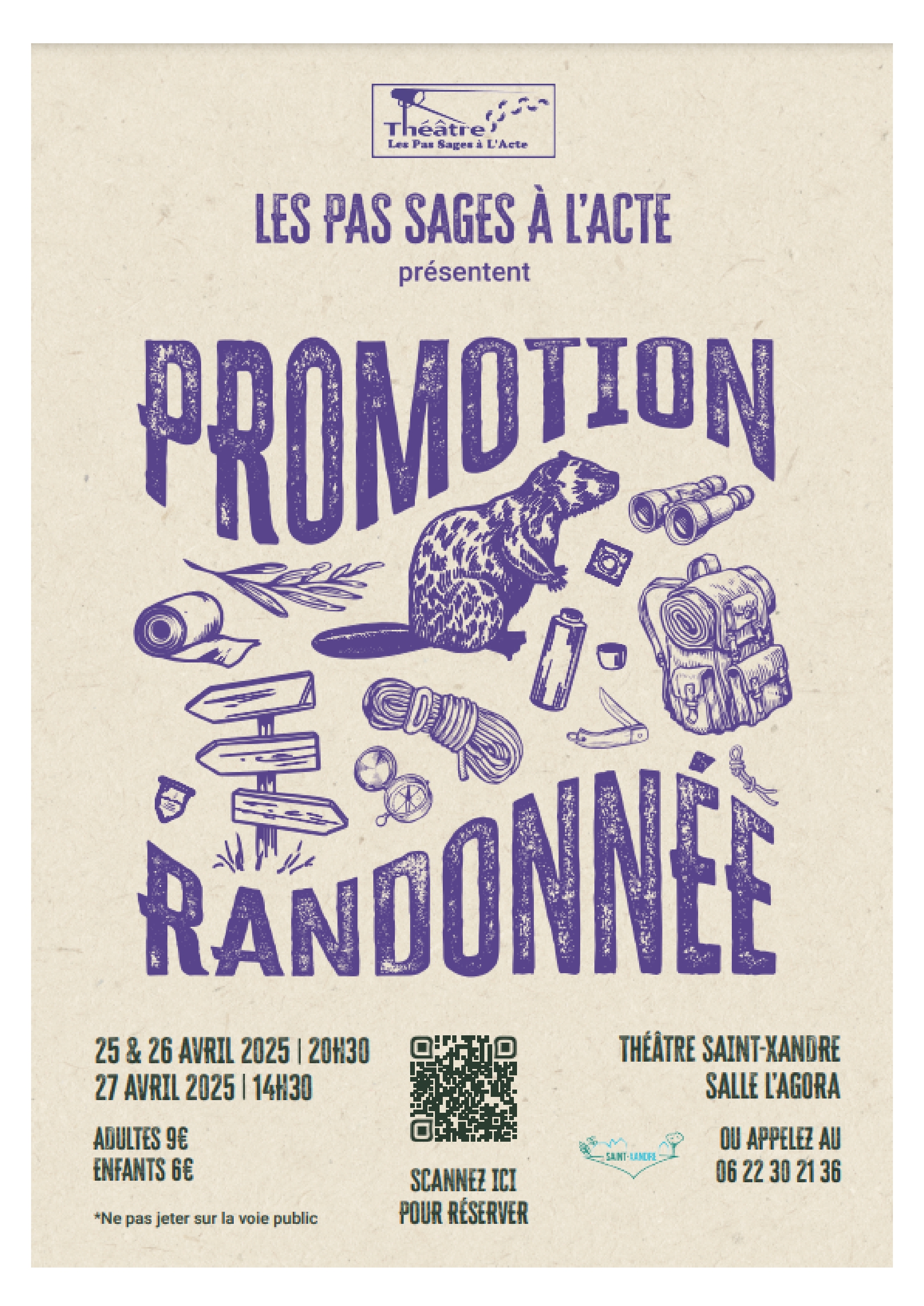 La troupe de théâtre de Saint-Xandre « Les Pas Sages à l’Acte » vous propose trois représentations de leur toute dernière comédie « Promotion randonnée » les 25 et 26 avril à 20h30, et le 27 avril à 14h30, à la salle de l’Agora à Saint-Xandre. Tarif adulte 9€, 6€ pour les enfants. Renseignements et réservation au 06 22 30 21 36.