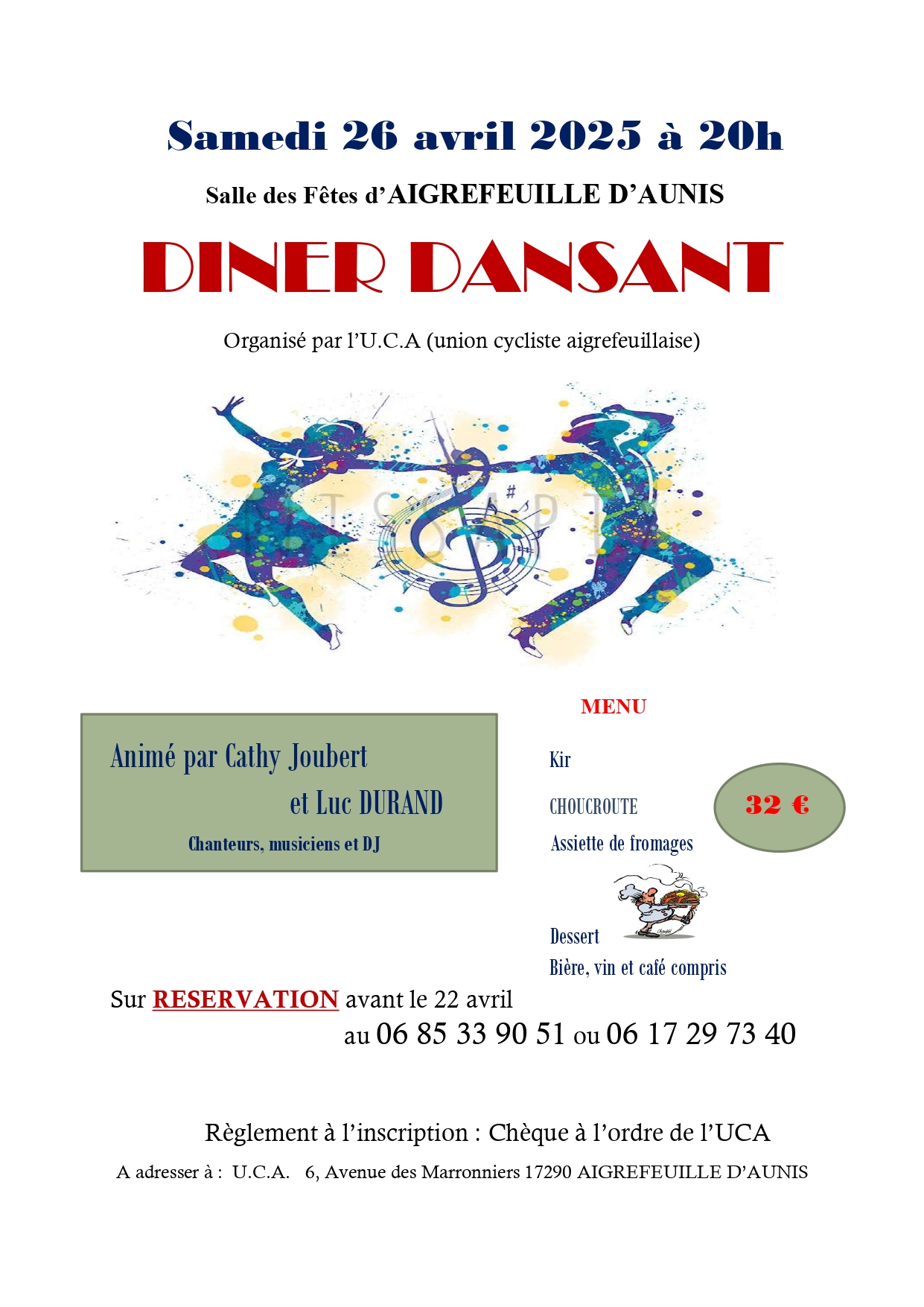 L’Union cycliste aigrefeuillaise organise un dîner dansant samedi 26 avril, à 20h, à la salle des fêtes d’Aigrefeuille-d’Aunis. Au menu : choucroute, assiette de fromages, dessert, bière, vin et café compris. 32€. La soirée et le bal seront animés par Cathy Joubert et Luc Durand, chanteurs, musiciens et DJ. Pour les renseignements et les réservations, vous pouvez contacter le 06 85 33 90 51 ou le 06 17 29 73 40. L’abus d’alcool est dangereux pour la santé, à consommer avec modération.