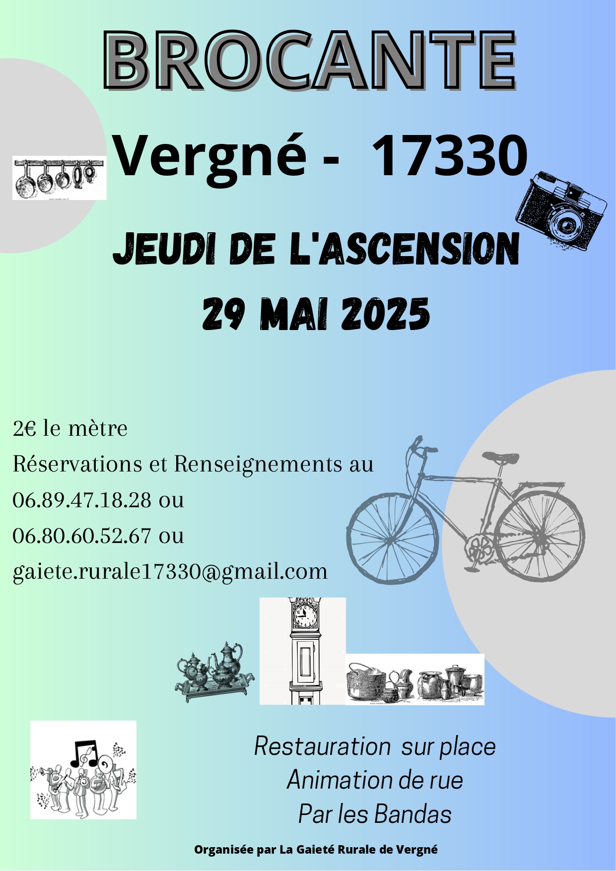 À Vergné, la Gaieté rurale organise sa brocante de l’Ascension, jeudi 29 mai. 2€ le mètre. Sur place : animation de rue avec la banda « Les Dis’onnants » et restauration. Pour les renseignements et les réservations, vous pouvez appeler le 06 89 47 18 28 ou le 06 80 60 52 67 et par mail gaiete.rurale17330@gmail.com.