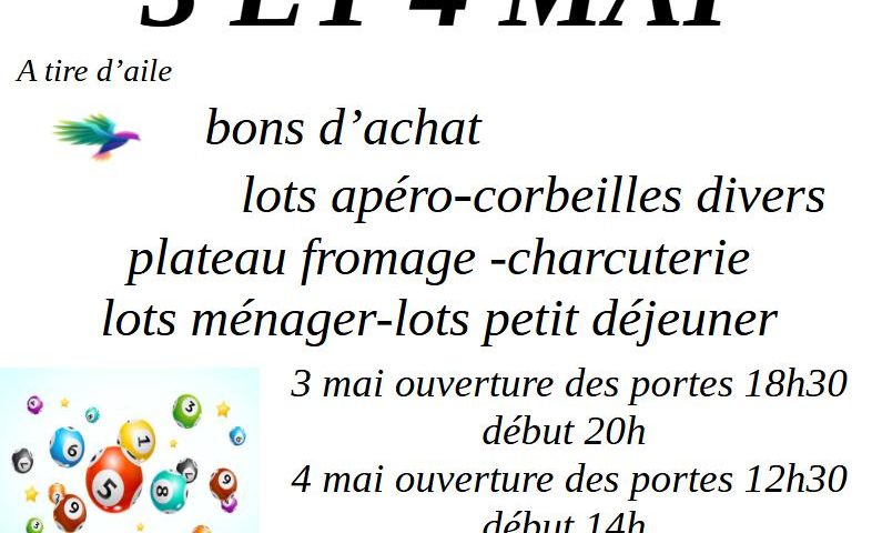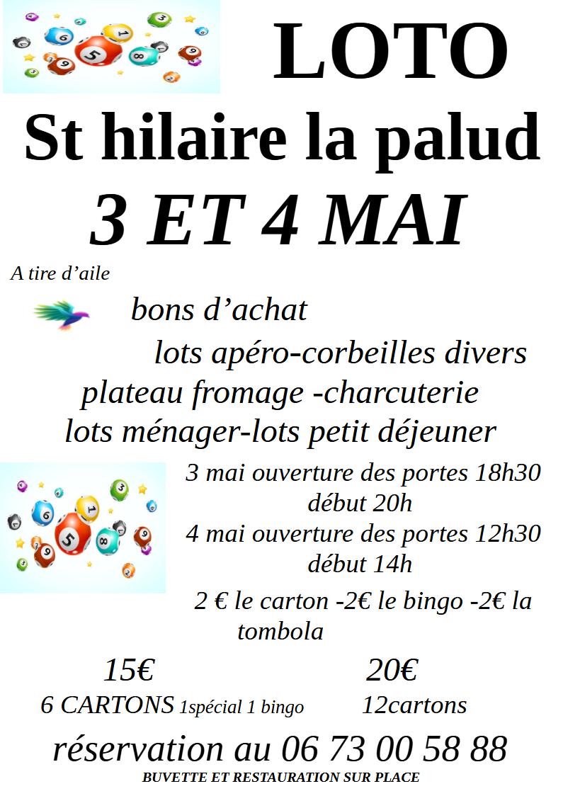 À Saint-Hilaire-La-Palud, l’association À tire d’aile organise deux lotos samedi 3 mai, à 20h, et dimanche 4 mai, à 14h. À gagner : des bons d’achat, lots apéro, ménager et petit déjeuner, corbeilles divers, plateau fromage, charcuterie, et bien d’autre. 2€ le carton, le bingo et la tombola. 15€ les 6 cartons avec un spécial et un bingo. 20€ les 12. Buvette et restauration sur place. Réservation au 06 73 00 58 88. Ouverture des portes le samedi à 18h30 et le dimanche à 12h30.