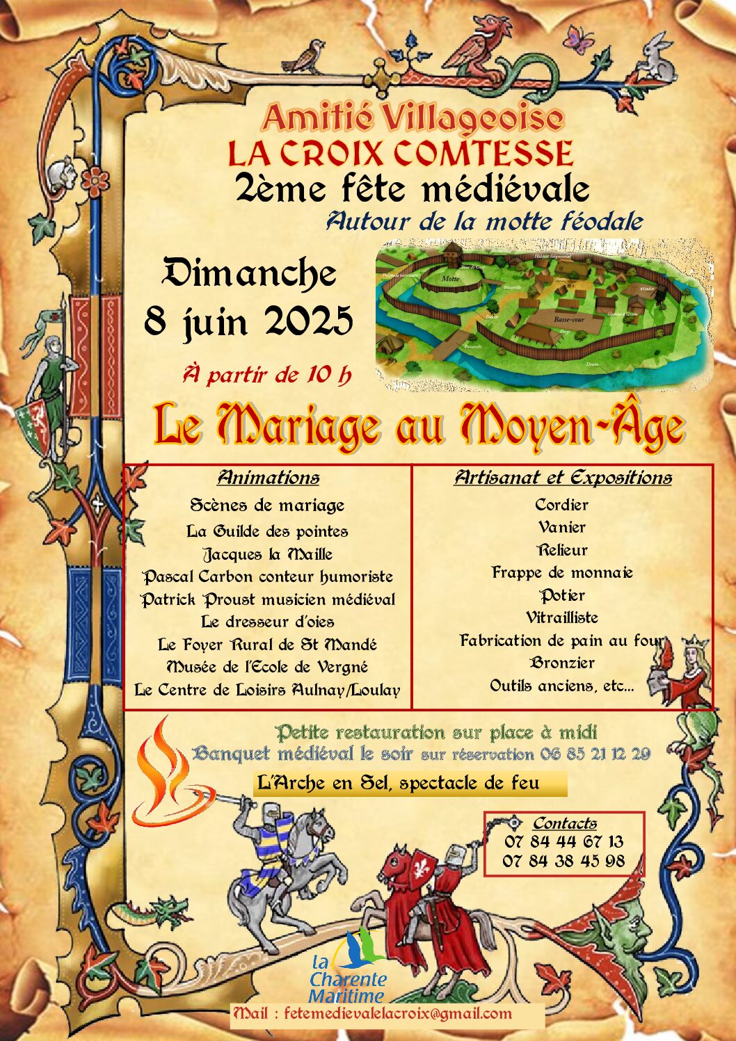 L’Amitié villageoise de La Croix-Comtesse organise sa 2ème Fête médiévale autour de la motte féodale dimanche 8 juin, à partir de 10h. Venez festoyer, vous immerger dans l’ambiance du Moyen-Âge et assister au dénouement des amours d’Aélis. Toute la journée, retrouvez taverne et produits de bouche, artisans et créateurs, animations et démonstrations, troubadours et chevaliers conteurs, activités pour les enfants, jeux en bois et de combats, déambulation musicale. Deux représentations théâtrales de la pièce « Au nom de l’amour » seront proposées. Restauration sur place : banquet le soir sur réservation au 06 85 21 12 29, suivi du spectacle de feu de « L’Arche en sel ». Entrée 7€, gratuit pour les enfants de moins de 12 ans. Pass journée, entrée, banquet et spectacle adulte 30€, enfants de 6 à 12 ans 10€. Spectacle seul 5€. Renseignements au 07 84 44 67 13 ou au 07 84 38 45 98.