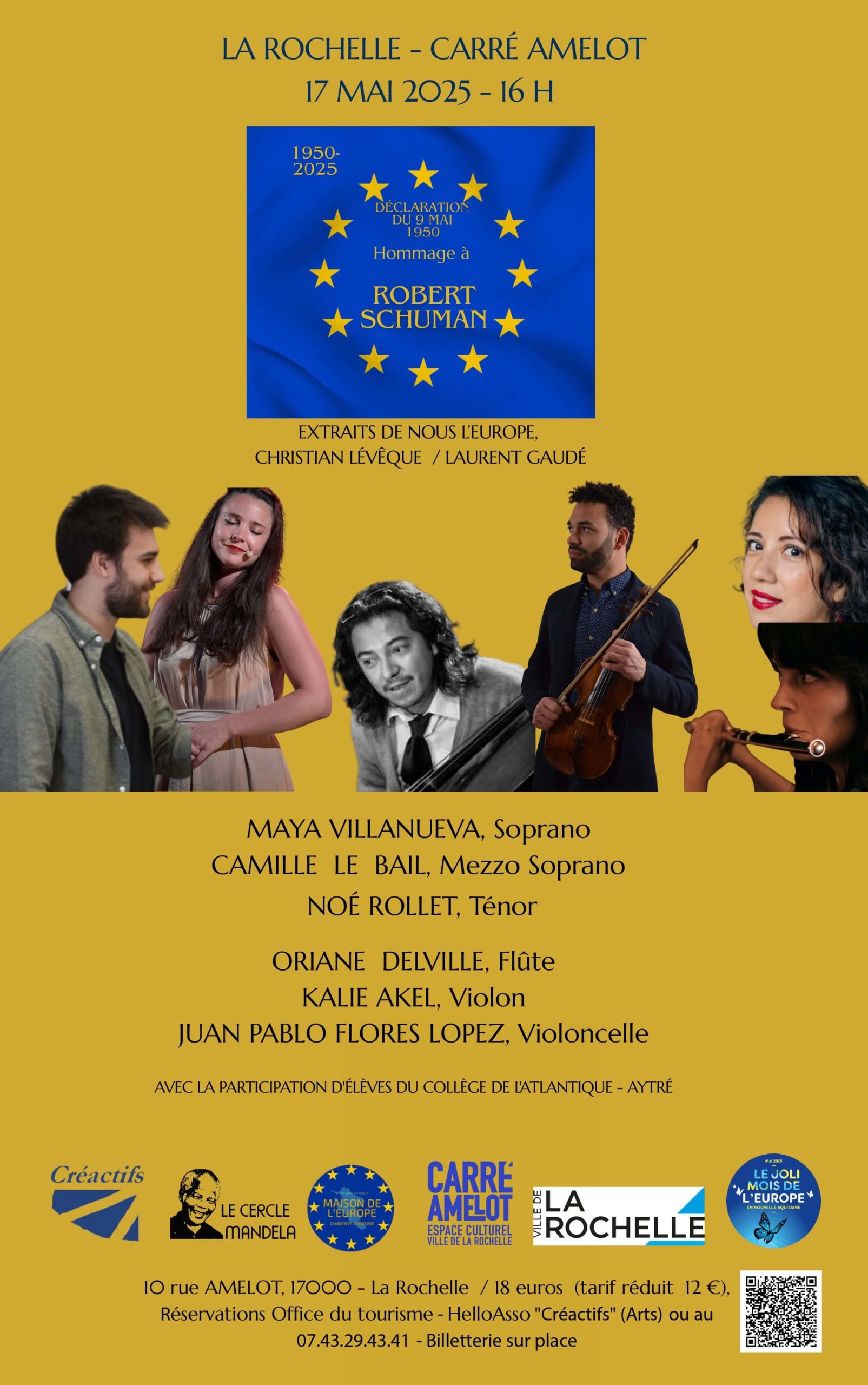 Durant l’opération « Le joli mois de l’Europe », la Maison de l’Europe de la Charente-Maritime et Créactifs organisent un concert, à l’occasion du 75ème anniversaire de la Déclaration de Robert Schuman. Rendez-vous samedi 17 mai au Carré Amelot à La Rochelle, à 16h. Avec la présence de la soprano Maya Villanueva, du mezzo-soprano Camile Le Bail, du ténor Noé Rollet, accompagné à la flûte par Oriane Delville, au violon Kalie Akel et au violoncelle Juan Pablo Flores Lopez. Avec la participation des élèves du collège de l’Atlantique d’Aytré. Tarif 18€ et réduit 12€. Réservation à l’office de tourisme, sur Helloasso « créactifs » ou au 07 43 29 43 41. Billetterie sur place.