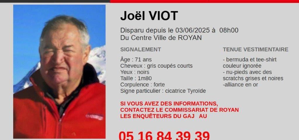 Un appel à témoins a été lancé hier par la police nationale après la disparition inquiétante d’un homme de 71 ans à Royan. Joël Viot a été vu pour la dernière fois ce mardi matin vers 8h en centre-ville. Le septuagénaire a les cheveux gris coupés courts, les yeux noirs et mesure 1,80m. Il est de forte corpulence et présente une cicatrice à la thyroïde. Il porte un bermuda et un tee-shirt, des nu-pieds à scratchs gris et noirs et une alliance dorée. Si vous avez des informations, vous pouvez contacter le commissariat de Royan au 05 16 84 39 39.