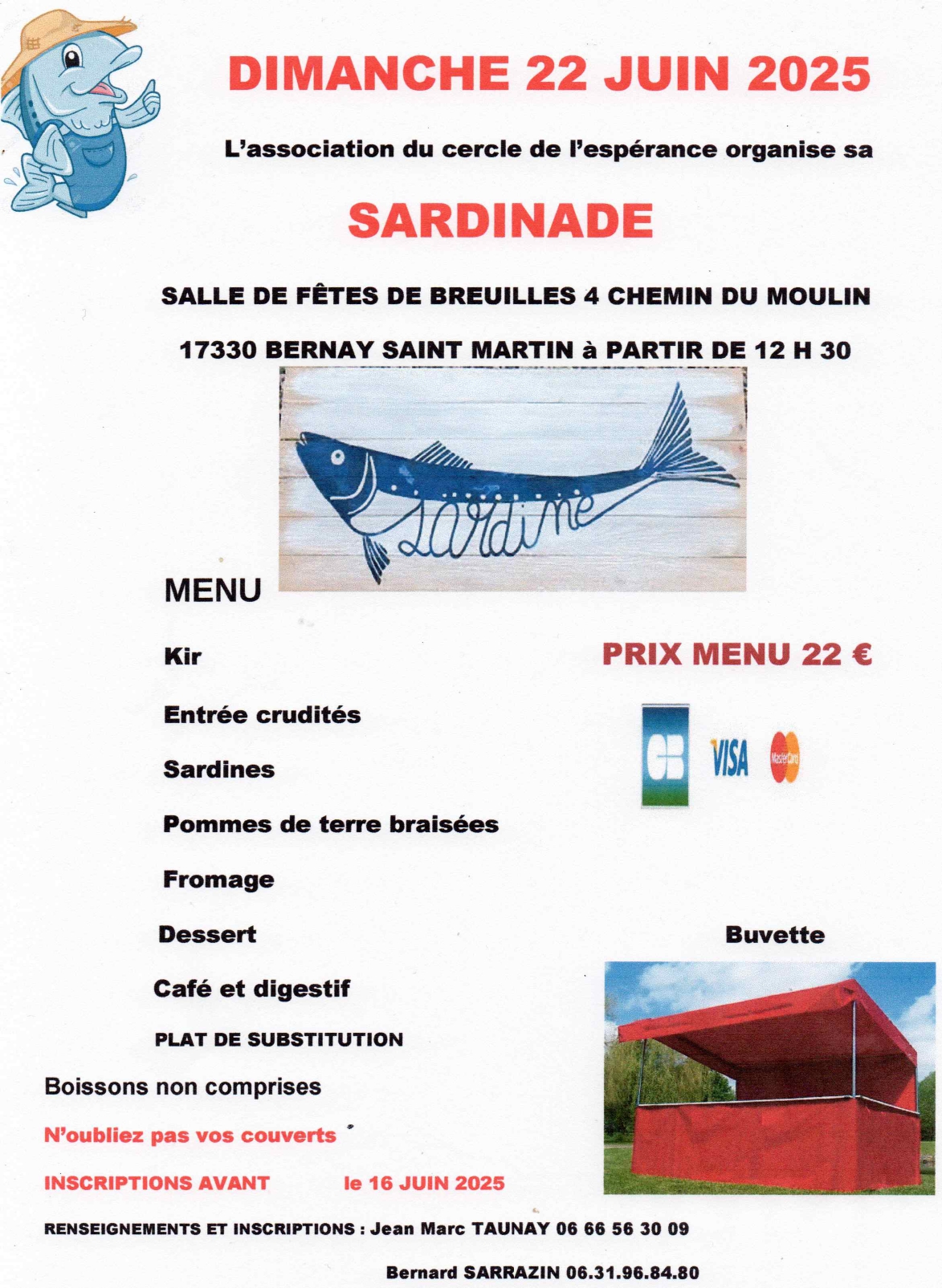 À Bernay-Saint-Martin, le Cercle de l’espérance organise sa sardinade à la salle de Breuilles, 4 chemin du moulin, dimanche 22 juin, à 12h30. Au menu à 22€ : kir, entrée crudités, sardines, pommes de terre braisées, fromage, dessert, café et digestif. Plats de substitution. Boissons non comprises. Apportez vos couverts. Inscriptions avant le 16 juin. Renseignements et réservations au 06 66 56 30 09 ou au 06 31 96 84 80. L’abus d’alcool est dangereux pour la santé, à consommer avec modération.