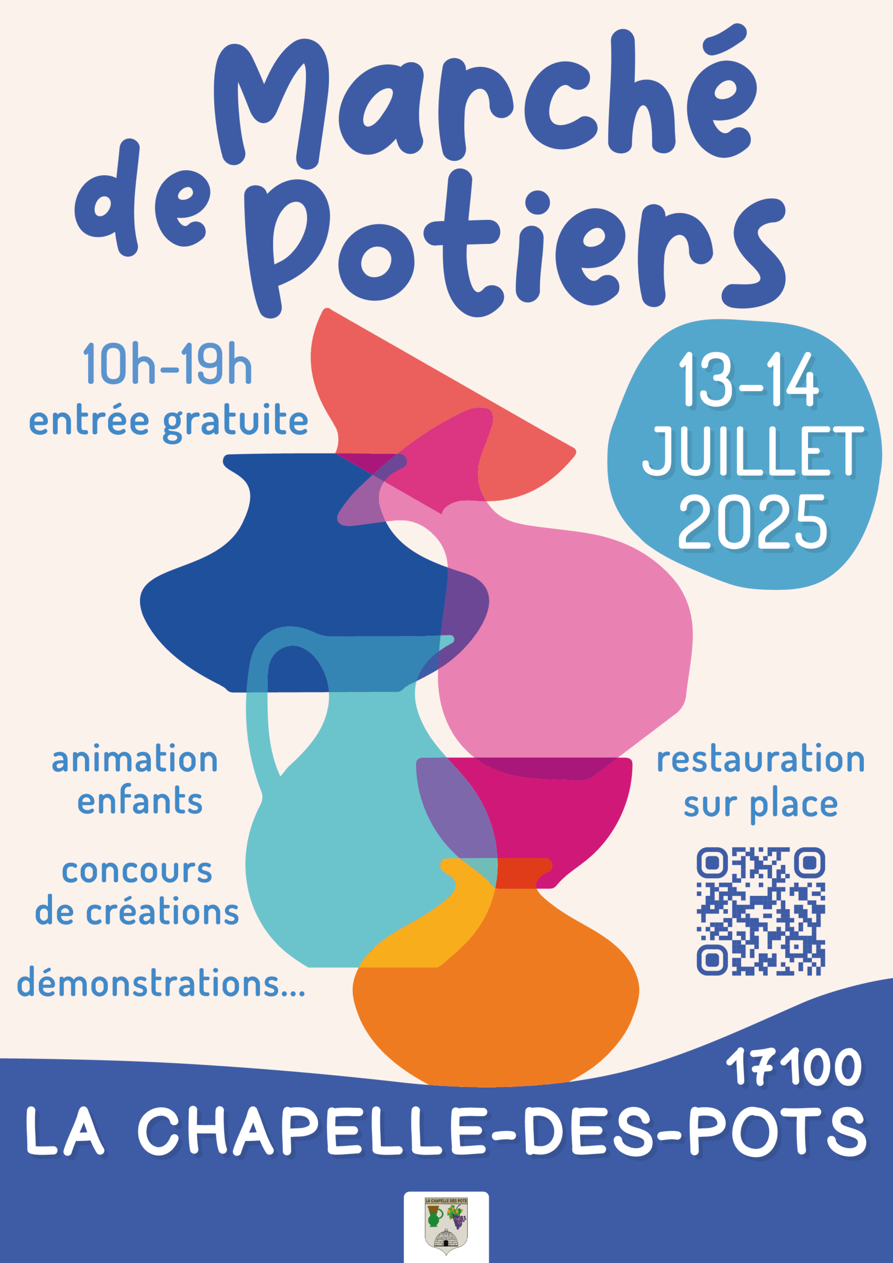 À La Chapelle-des-Pots, près de Saintes, un marché de potiers est organisé dimanche 13 et lundi 14 juillet, de 10h à 19h. Sur place, exposition archéologique de poterie produite à La Chapelle-Des-Pots, vente, démonstrations de tournage, atelier enfants, concours sur le thème de la Liberté et restauration. Entrée gratuite. Renseignements au 06 50 85 63 30.