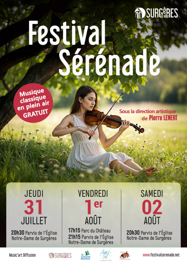 Zoom sur le prochain festival Sérénade à Surgères. Organisé par l’association Music’Art diffusion, en partenariat avec la Ville, l’évènement de musique de chambre revient pour une 21e édition exceptionnelle du 31 juillet au 2 août, dans le parc du château. Il est de nouveau placé sous la direction du 1er alto super soliste de l’Opéra de Paris Pierre Lénert, qui a invité cette année encore des artistes internationaux d’exception pour séduire un public toujours plus nombreux, comme le souligne Catherine Desprez, maire de Surgères :